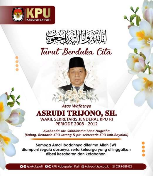 KPU Kabupaten Pati turut berbelasungkawa dan berdukacita atas berpulangnya Bpk. Asrudi Trijono, SH., semoga amal ibadah beliau di terima Allah SWT, dan diampuni segala dosanya. Serta keluarga yang di tinggalkan diberi kesabaran dan ketabahan. Aamiin