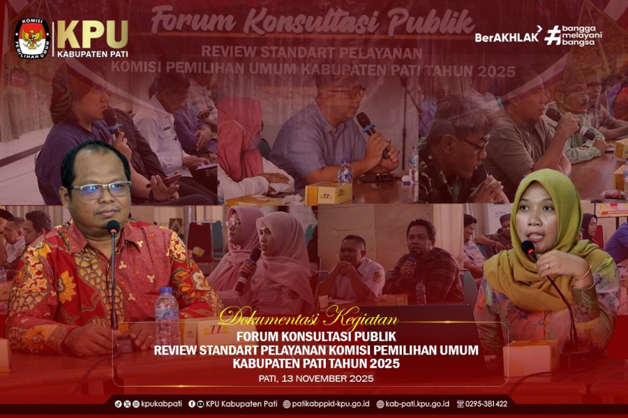 Guna meningkatkan kualitas pelayanan informasi yang lebih baik kepada masyarakat. KPU Kabupaten Pati menggelar Forum Konsultasi Publik (FKP) Review Standar Pelayanan Komisi Pemilihan Umum Kabupaten Pati Tahun 2025.