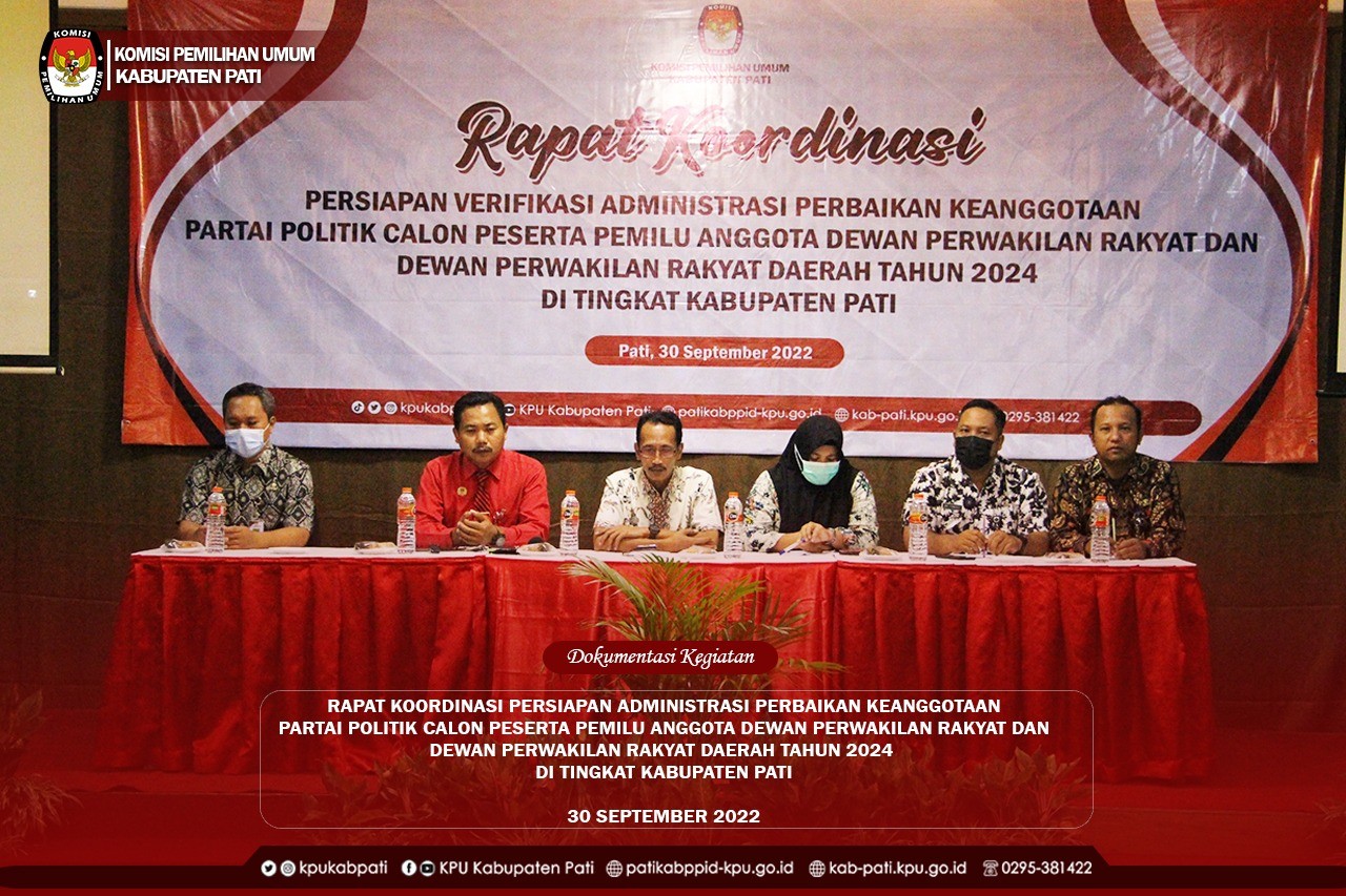 Jumat, 30 September 2022 KPU Kabupaten Pati melaksanakan Rapat Koordinasi Persiapan Verifikasi Administrasi Perbaikan Keanggotaan Partai Politik Calon Peserta Pemilu Anggota Dewan Perwakilan Rakyat dan Dewan Perwakilan Rakyat Daerah Tahun 2024 di Tingkat Kabupaten Pati.