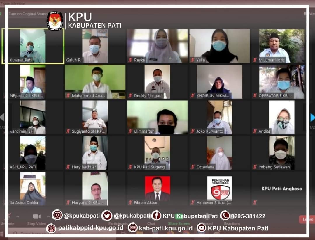 Sobat pemilih, salah satu upaya KPU Kabupaten Pati untuk memastikan pelaksanakan tugas pokok dan fungsi kelembagaan tetap berjalan, yaitu dengan menyelenggarakan Apel Pagi setiap hari Senin pukul 08:00 WIB, dilanjutkan dengan Rapat Koordinasi Internal yang dilaksanakan melalui daring (Zoom Meeting). Apel (19/7) dipimpin oleh Sekretaris KPU Kabupaten Pati, Sugeng Santosa S.Sos, dan diikuti oleh komisioner, pejabat struktural dan seluruh pegawai KPU Kabupaten Pati dengan tetap mematuhi protokol kesehatan. Kegiatan ini dilakukan untuk memastikan seluruh pegawai KPU Kabupaten Pati tetap memenuhi tugas dan kewajibannya meskipun dari kediaman masing-masing pada saat pemberlakukan WFH sebagai bentuk dukungan terhadap kebijakan PPKM Darurat dalam rangka mencegah penyebaran Covid-19.