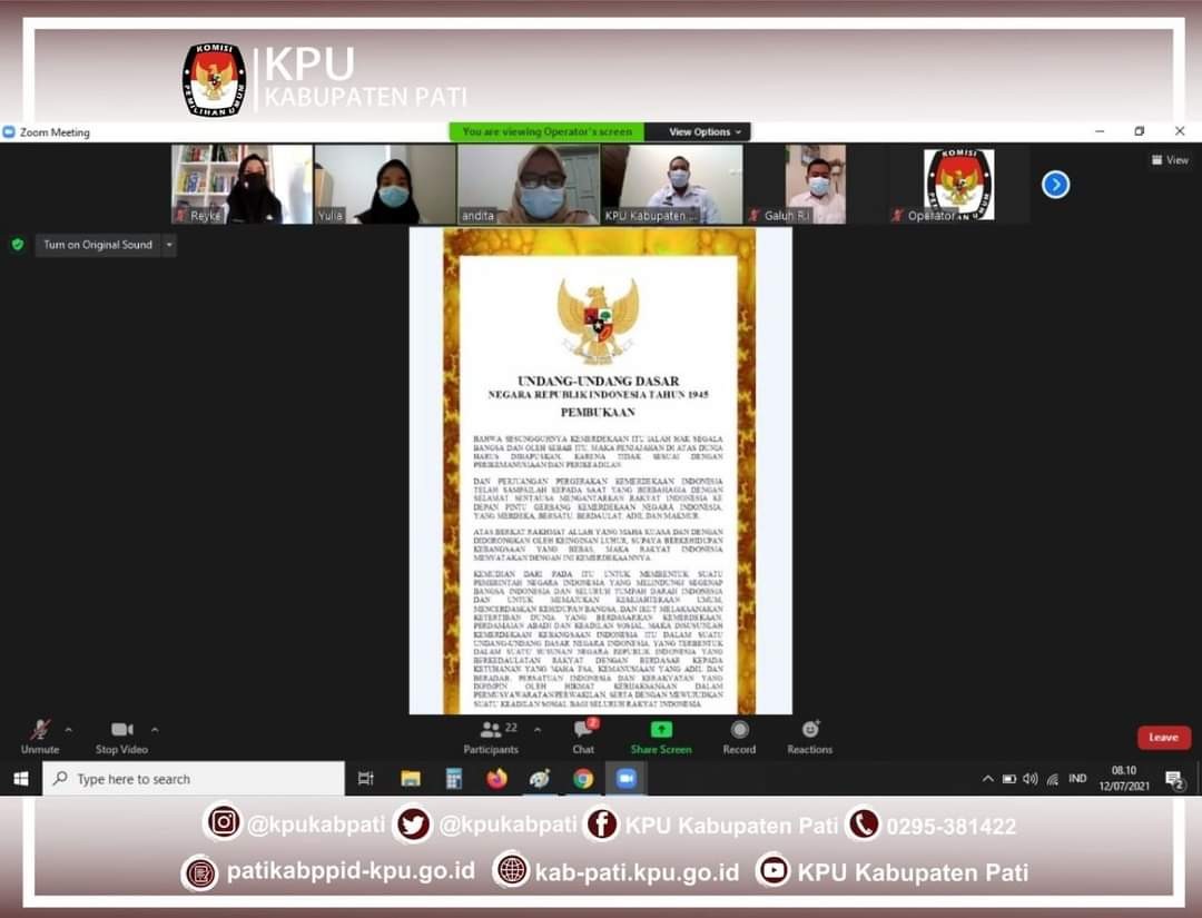 Sobat pemilih, Senin (12/7) KPU Kabupaten Pati mengawali kegiatan hari ini dengan apel pagi secara daring melalui zoom meeting. Apel dipimpin oleh Sekretaris KPU Kabupaten Pati, Sugeng Santosa S.Sos, dan diikuti oleh komisioner, pejabat struktural dan seluruh pegawai KPU Kabupaten Pati dengan tetap mematuhi protokol kesehatan.
