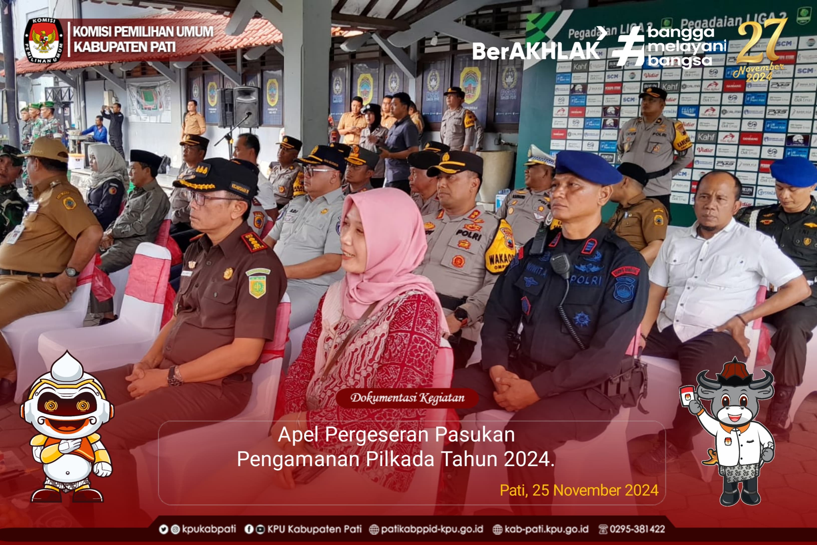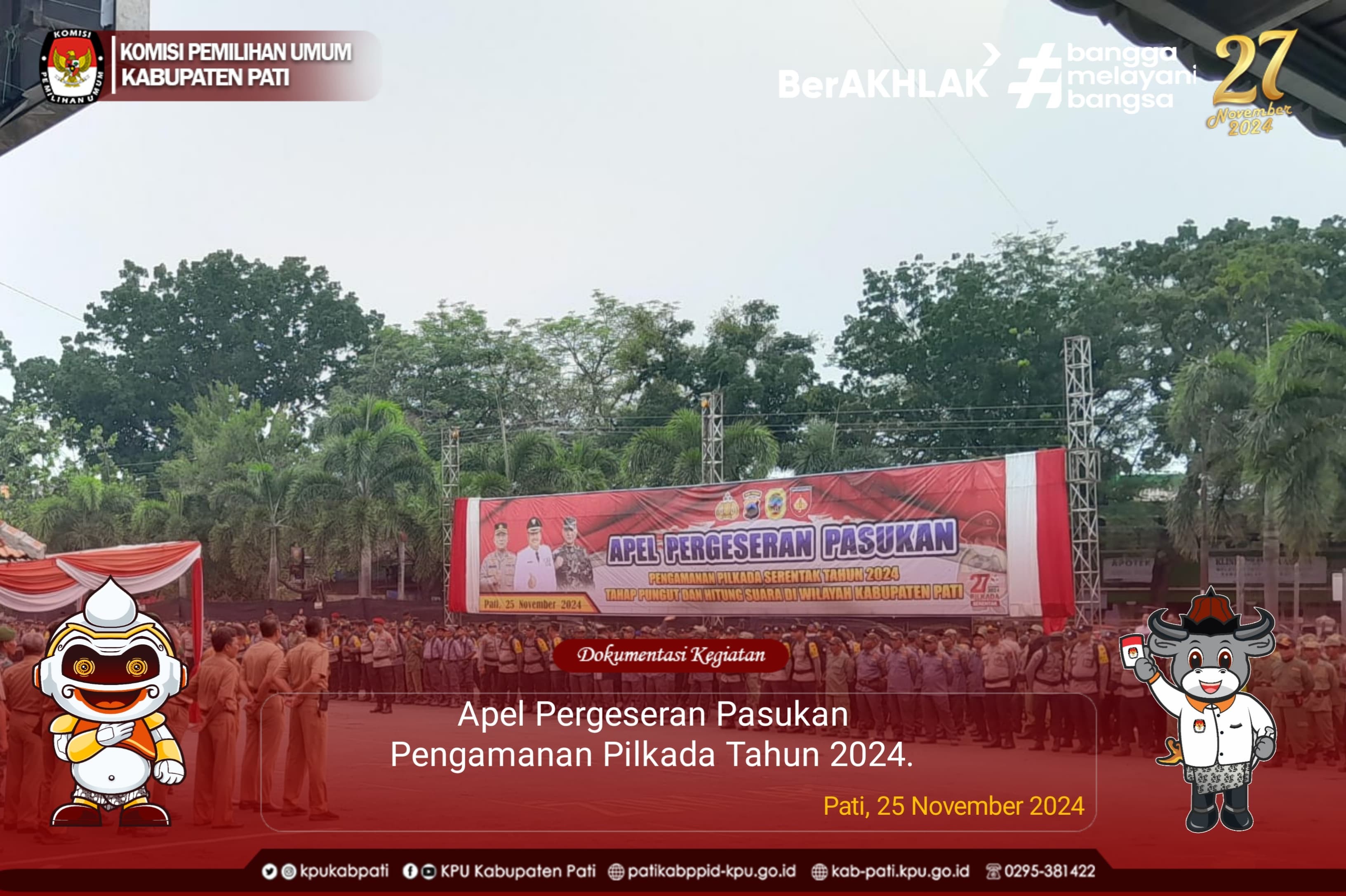 KPU Kabupaten Pati pada hari senin tanggal 25 November 2024 bertempat di halaman stadion joyo kusumo mengikuti pelaksanaan Apel Pergeseran Pasukan Pengamanan Pemilihan Gubernur dan Wakil gubernur, Bupati dan Wakil Bupati Kabupaten Pati Tahun 2024 yang dilaksanakan Polresta Pati