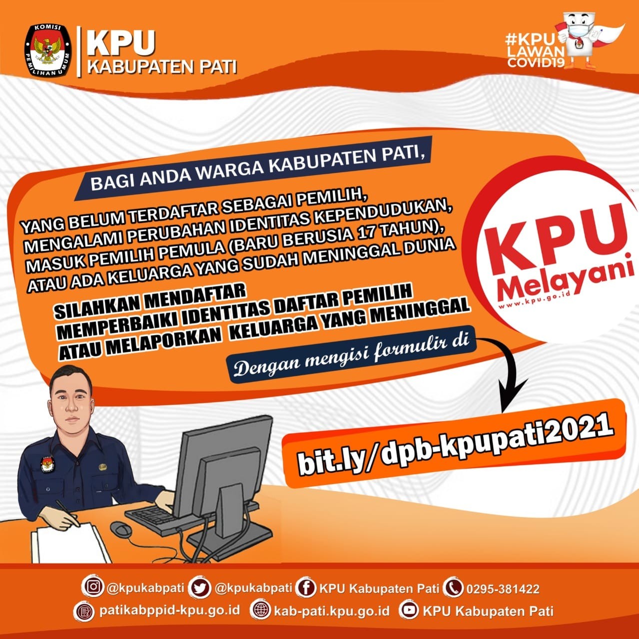 Bagi anda warga Kabupaten Pati yang belum terdaftar sebagai pemilih, mengalami perubahan identitas kependudukan, masuk pemilih pemula (baru berusia 17 tahun), atau ada keluarga yang sudah meninggal dunia, silahkan mengisi formulir di bit.ly/dpb-kpupati2021