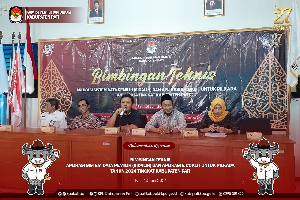 KPU Kabupaten Pati melaksanakan kegiatan bimbingan teknis aplikasi sistem informasi data pemilih (SiDalih) pada Senin, 10 Jani 2024. Kegiatan dibuka oleh Anggota KPU Kabupaten Pati divisi Teknis Penyelenggaraan Pemilu , Khusnul Imanuddin. Kegiatan mengundang seluruh divisi Data Infomasi PPK Se-Kabupaten Pati, kegiatan berlansung di Aula KPU Kabupaten Pati mulai Pukul 10.00 WIB hingga malam hari.