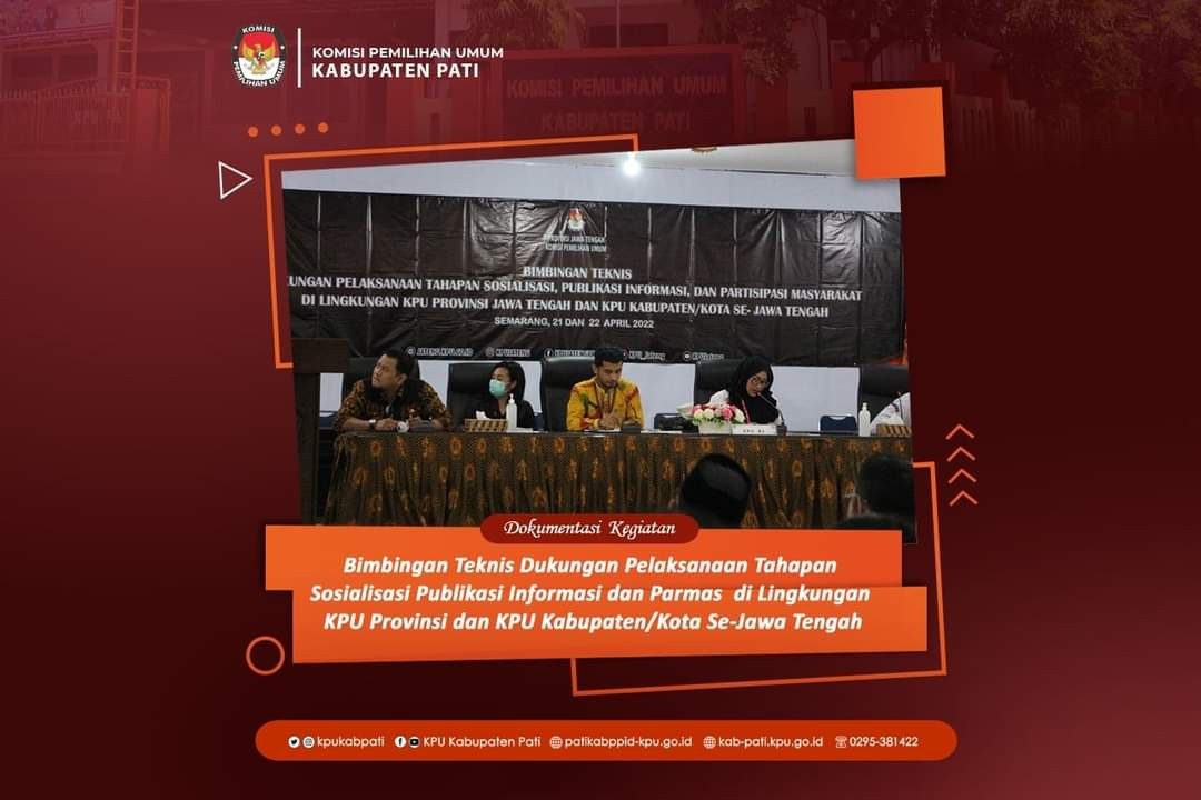 Haryono, S.H.I, M.H. Ketua Divisi Sosialisasi, Pendidikan Pemilih dan Partisipasi Masyarakat Beserta Kasubbag dan Staf Teknis Penyelenggaraan Pemilu, Partisipasi, dan Hubungan Masyarakat KPU Kabupaten Pati mengikuti Bimbingan Teknis Dukungan Pelaksanaan Tahapan Sosialisasi Publikasi Informasi dan Parmas di Lingkungan Provinsi dan KPU Kabupaten/Kota Se-Jawa Tengah. Kegiatan dilaksanakan pada 21 dan 22 April 2022 di Aula KPU Provinsi Jawa Tengah Jl. Veteran No. 1A Kota Semarang.