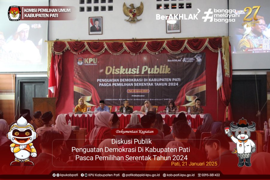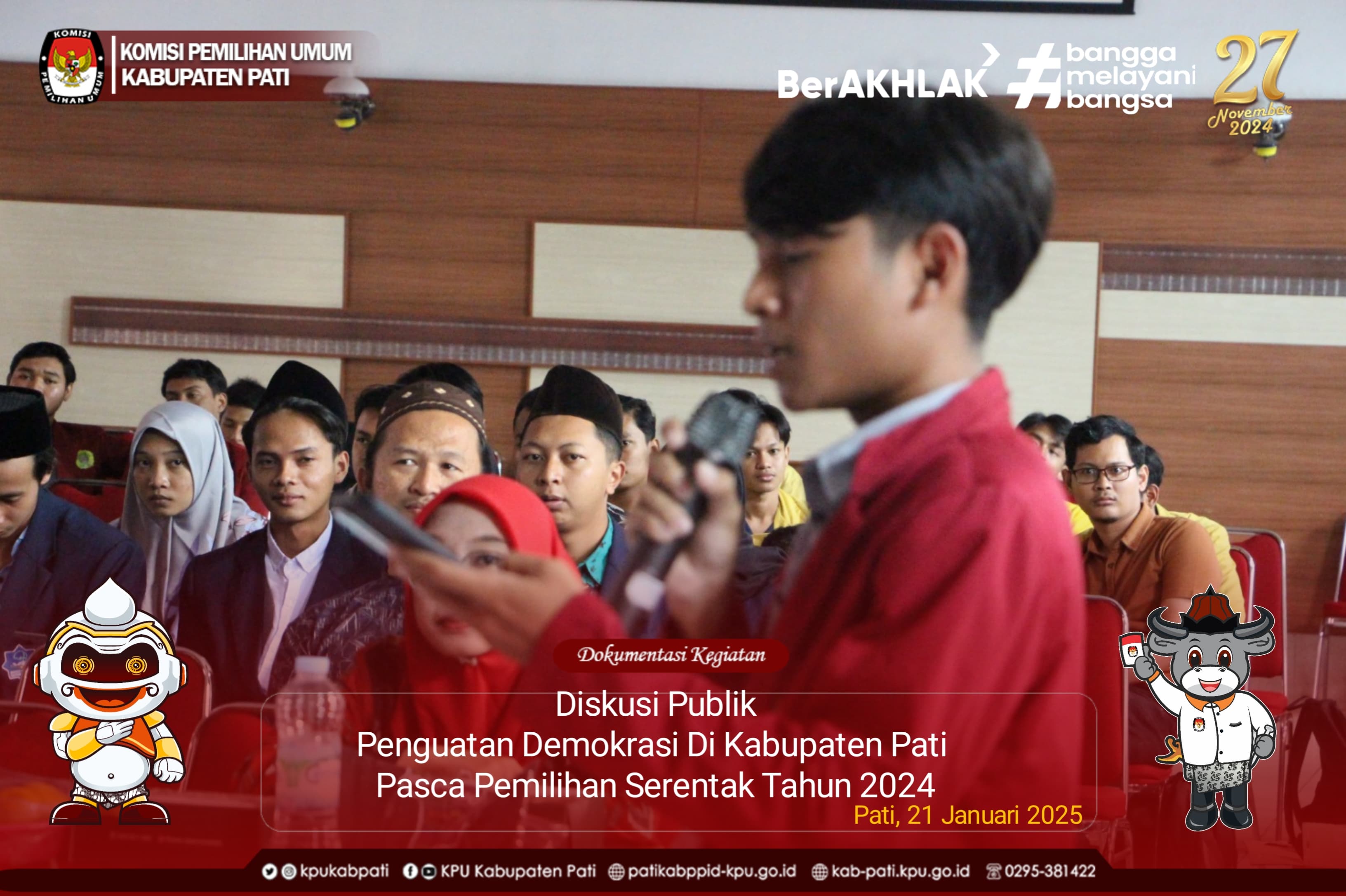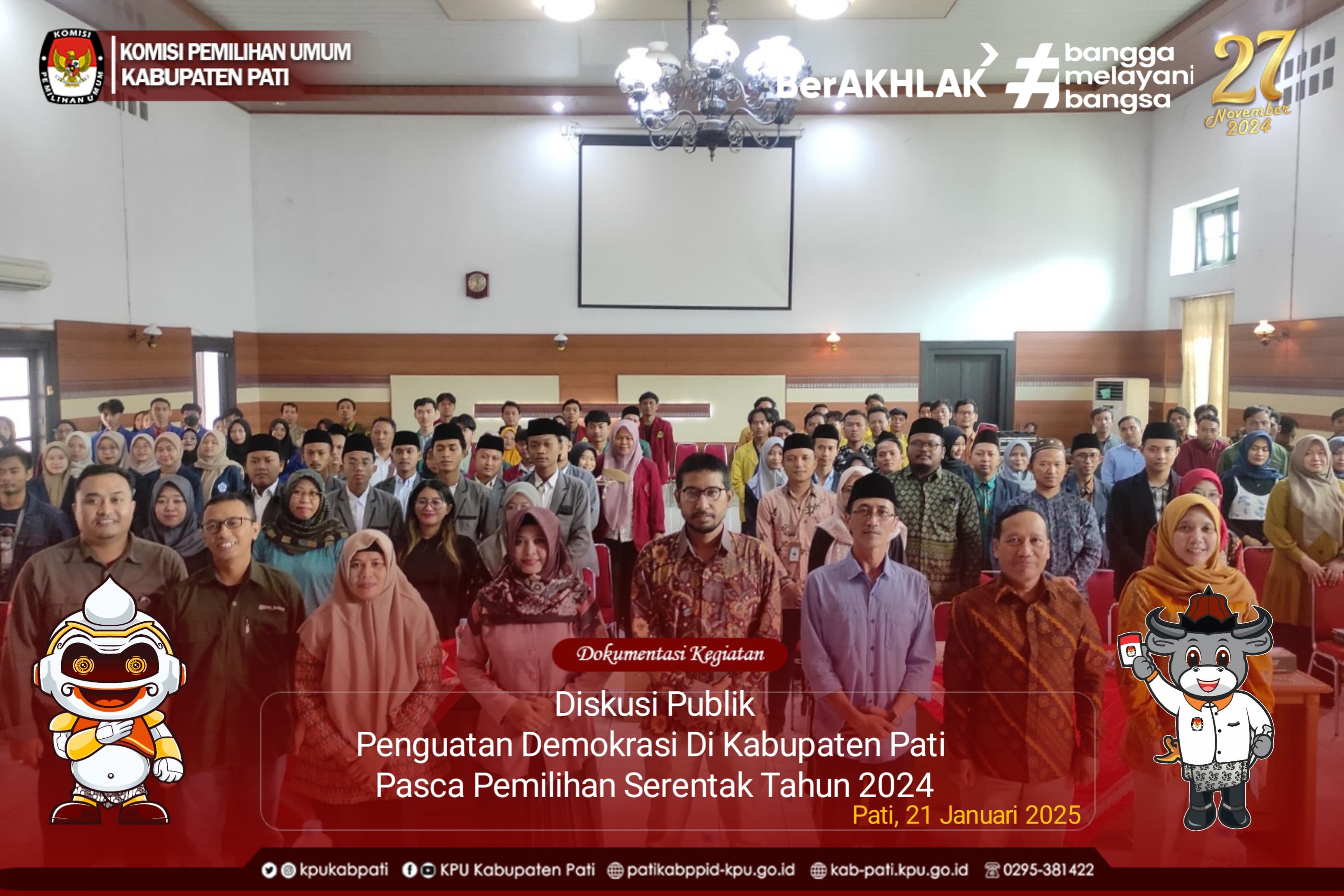 KPU kabupaten Pati pada hari selasa 21 Januari 2025 menyelenggrakan Diskusi Publik Penguatan Demokrasi DI Kabupaten Pati Pasca pemilihan serentak Tahun 2024 dengan mahasiswa/i Universitas yang ada di Kabupaten Pati. Kegiatan yang menghadirkan mahasiswa dari 8 ( delapan ) Universitas di kabupaten Pati tersebut dilaksanakan di Aula Bakorwil 1 Pati tersebut dilaksanakan dengan meriah dan antusias dari segenap peserta.