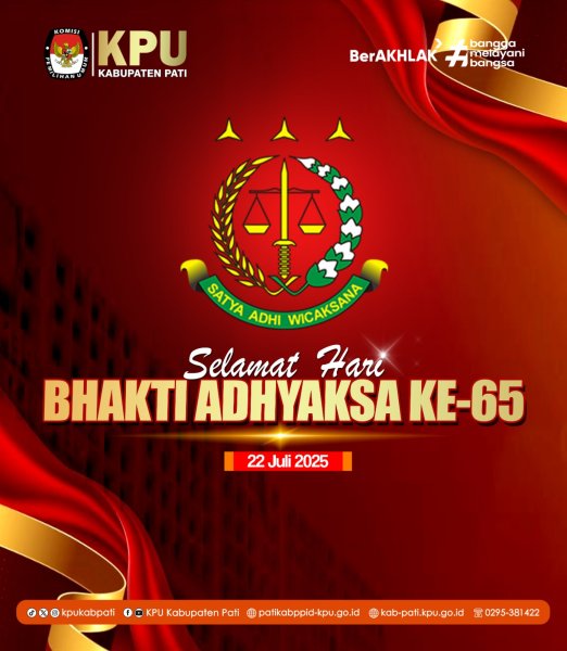 Segenap keluarga besar KPU Kabupaten Pati mengucapkan Selamat Memperingati Hari Bhakti Adhyaksa ke-65.