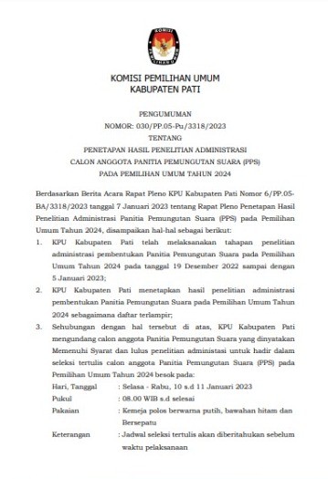 KPU Kabupaten Pati mengundang calon Anggota Panitia Pemungutan Suara yang dinyatakan Memenuhi Syarat dan Lulus Penelitian Administrasi untuk hadir dalam seleksi tertulis pada: Hari Selasa - Rabu tanggal 10 s.d 11 Januari 2023.