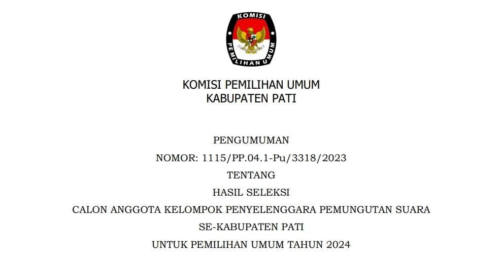 Berikut Hasil Seleksi Calon Anggota Kelompok Penyelenggara Pemungutan Suara Se-Kabupaten Pati Untuk Pemilihan Umum Tahun 2024.Pengumuman tertuang dalam Nomor :1115/PP.04.1-Pu/3318/2023.
