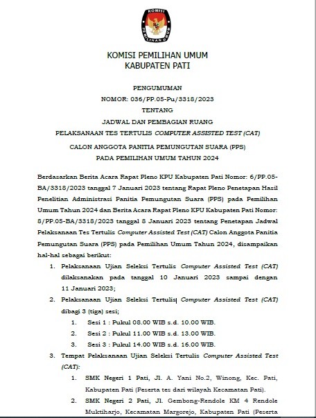 Berikut jadwal dan pembagian ruang pelaksanaan Tes Tertulis Computer Assited Test (CAT) Panitia Pemungutan Suara (PPS) untuk Pemilihan Umum Tahun 2024 di lingkungan KPU Kabupaten Pati.