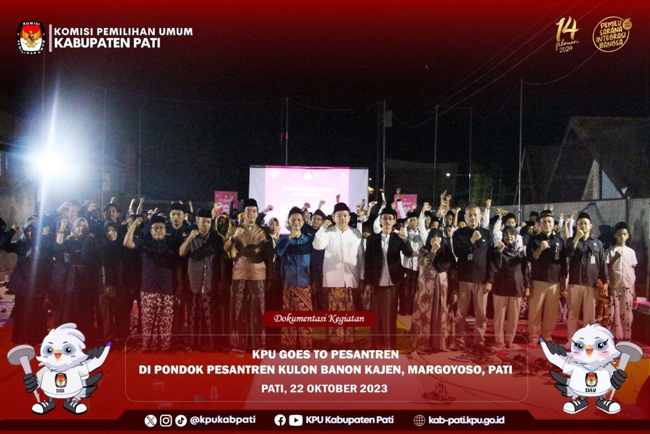 Minggu (22/10/2023), bersamaan dengan Hari Santri Nasional KPU Kabupaten Pati mengadakan acara nonton bareng (nobar) film "Kejarlah Janji" di Ponpes Kulon Banon Kajen, Margoyoso. Acara ini dihadiri oleh Plt Ketua KPU Kabupaten Pati Haryono, S.H.I., M.Si. dan Anggota KPU Kabupaten Pati divisi Hukum dan Pengawasan Sunarsih, S.Ag., M.H.