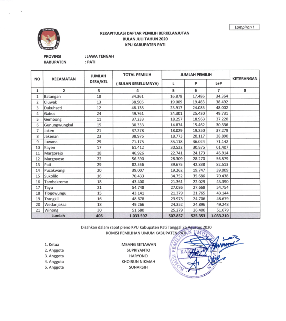 Komisi Pemilihan Umum (KPU) Kabupaten Pati pada bulan Agustus 2020 ini menggelar rapat pleno terbuka secara daring untuk pertama kalinya. Rapat pleno terbuka Rekapitulasi Daftar Pemilih Berkelanjutan (DPB) untuk periode Juli 2020 itu digelar pada Rabu (26/8/2020) di aula KPU Kabupaten Pati. Rapat dipimpin Ketua KPU Kabupaten Pati Imbang Setiawan bersama empat komisioner lainnya, yaitu Supriyanto, Haryono, Khoirun Nikmah, dan Sunarsih, serta Sekretaris KPU Imam Kartiko. Seluruh peserta rapat mengikutinya secara daring, antara lain Ketua beserta seluruh Anggota Bawaslu Kabupaten Pati, perwakilan 16 partai politik peserta Pemilu 2019 di Tingkat Kab. Pati, Dinas Kependudukan dan Catatan Sipil, Polres Pati, Kodim Pati, serta Bagian Pemerintah Kabupaten Pati.