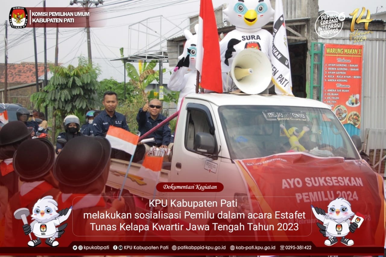 Dalam rangka mensukseskan pelaksanaan Pemilu Tahun 2024 KPU Kabupaten Pati turut serta melakukan sosialisasi Pemilu dalam acara Estafet Tunas Kelapa Kwartir Jawa Tengah Tahun 2023. KPU Sendiri menghadirkan boneka Sura Sulu sebagai bahan sosialisasi. Nampak antusias masyarakat yang ikut menyaksikan acara sepanjang jalan Kecamatan Kayen Sampai Kecamatan Sukolilo KPU Kabupaten Pati manfaatkan dengan mempopulerkan Jingle Pemilu serta membagikan bahan sosialisasi berupa stiker pelaksanaan pencoblosan Pemilu Tahun 2024.