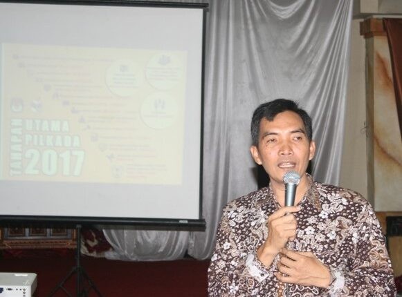 Much. Nasich Ketua KPU Kab. Pati selaku Narasumber menyampaikan materi tentang tahapan, anggaran dan juga syarat dukungan calon perseorangan dalam Pilbup 2017. Dalam Pilbup Pati 2017 ini, syarat dukungan calon perseorangan adalah 67.015 dukungan dari hitungan 6,5% kali DPT Pilpres 2014.