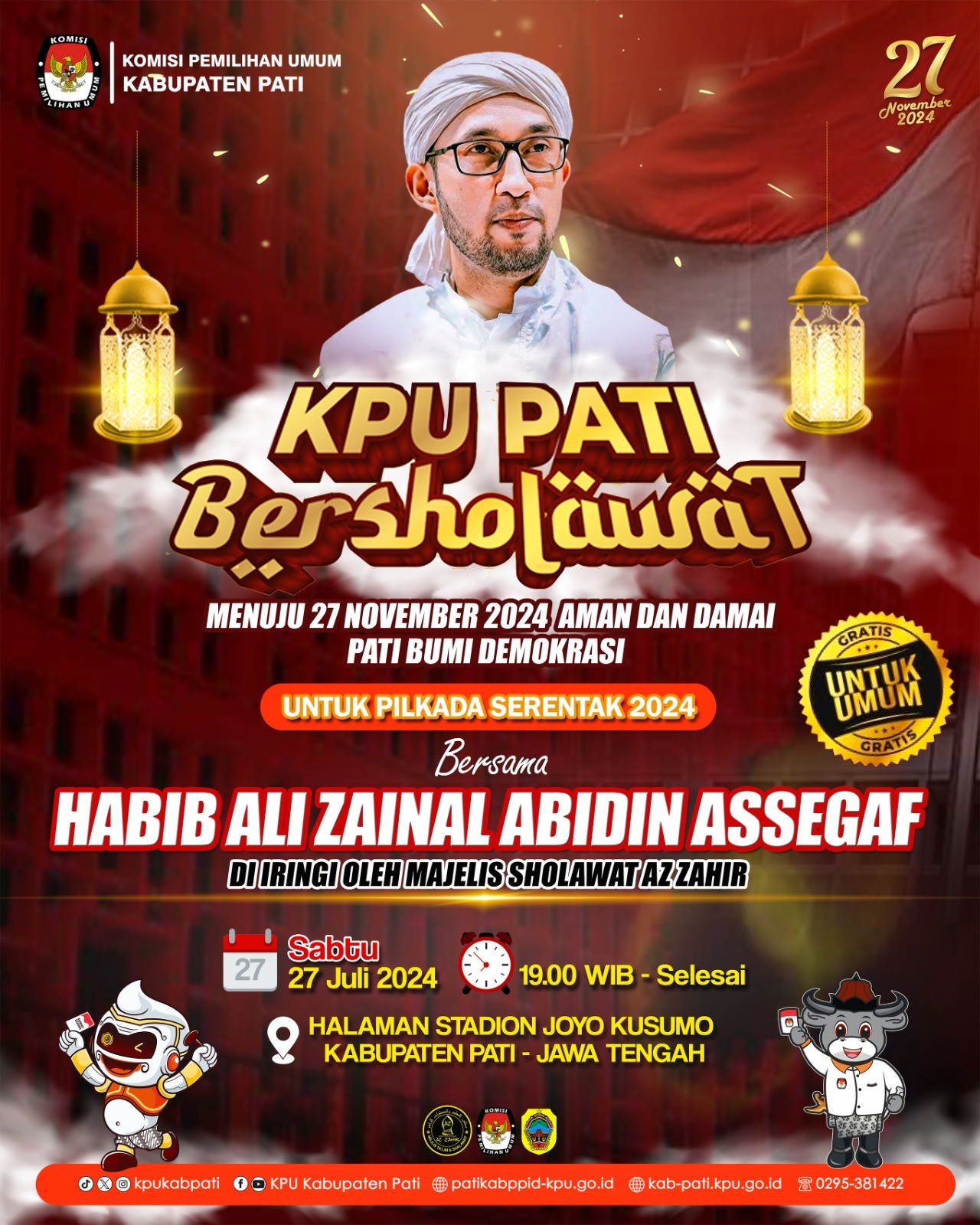 KPU Kabupaten Pati menyelenggarakan " KPU Pati Bersholawat" menuju 27 November 2024 Aman Dan Damai Pati Bumi Demokrasi Bersama Habib Ali Zaenal Abidin Assegaf diiringi oleh Majelis Sholawat Az-zahir.