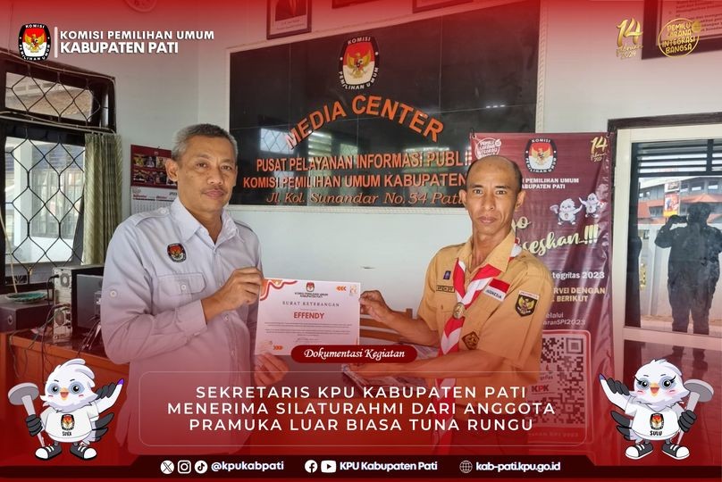 Sekretaris KPU Kabupaten Pati menerima kunjungan dan silaturahmi anggota Pramuka Luar Biasa atas nama Effendy. Beliau merupakan Anggota Pramuka tuna rungu yang sedang melakukan perjalanan keliling Indonesia dengan sepeda motor. Sugeng Santosa mengapresiasi perjalanan yang dilalukan oleh Effendy dengan semangatnya bekeliling Indonesia dan bersilaturahmi demi membawa nama Pramuka Indonesia, semoga diberikan kelancaran dan kesehatan dalam menempuh perjalanan selanjutntya.
