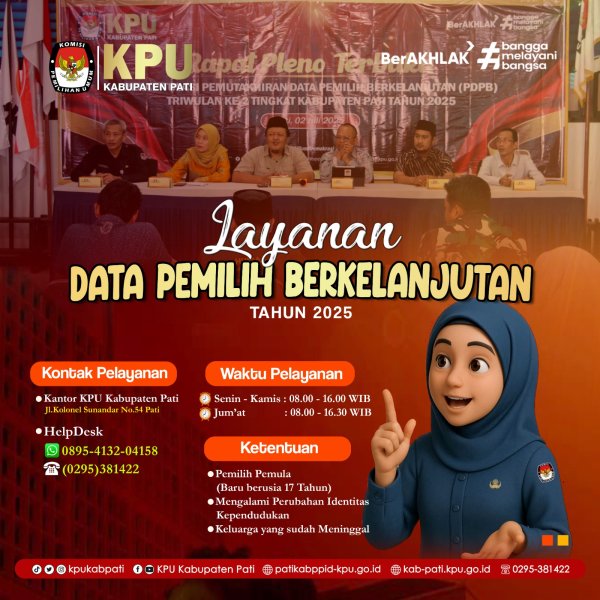 KPU Kabupaten Pati membuka Layanan Data Pemilih Berkelanjutan Tahun 2025 yang bertujuan untuk memperbaharui data pemilih, dengan ketentuan: