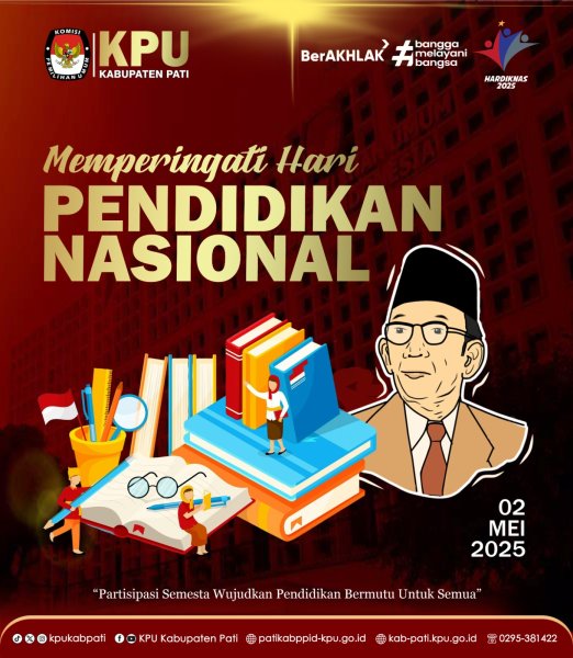 Segenap Jajaran Komisi Pemilihan Umum (KPU) Kabupaten Pati mengucapkan Selamat Hari Pendidikan Nasional 02 Mei 2025.