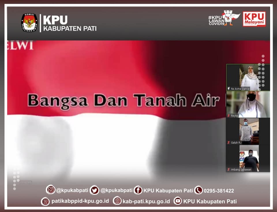 Dalam rangka memelihara dan meningkatkan rasa kebangsaan dan cinta tanah air, KPU Kabupaten Pati mendengarkan Lagu Kebangsaan Indonesia Raya pada Kamis, 19 Agustus 2021, pukul 10:00 WIB secara daring melalui Zoom Meeting. Zoom dipimpin oleh Sekretaris KPU Kabupaten Pati Sugeng Santosa, S.Sos, diikuti oleh Komisioner, Pejabat Struktural dan seluruh pegawai di lingkungan KPU Kabupaten Pati. Agar pelaksanaan tugas pokok dan fungsi kelembagaan tetap berjalan, kegiatan dilanjutkan dengan koordinasi internal untuk memastikan seluruh pegawai KPU Kabupaten Pati tetap memenuhi tugas dan kewajiban meskipun dari kediaman masing-masing pada masa pemberlakuan WFH PPKM Level 3 Kabupaten Pati.