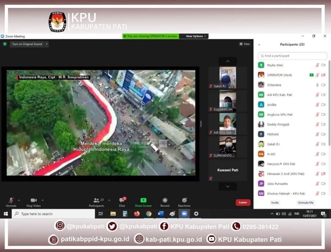 Dalam rangka memelihara dan meningkatkan rasa kebangsaan dan cinta tanah air, pengabdian terhadap negara dan rakyat Indonesia, serta ketaatan terhadap ideologi Pancasila dan UUD Negara Republik Indonesia Tahun 1945, KPU Kabupaten Pati mendengarkan Lagu Kebangsaan Indonesia Raya pada Selasa, 13 Juli 2021, pukul 10:00 WIB melalui zoom meeting.