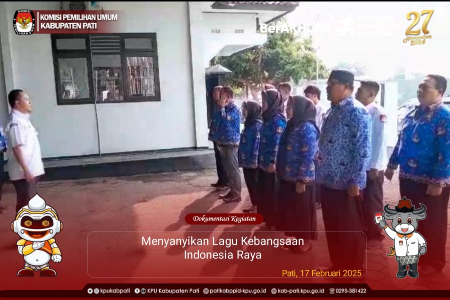 KPU Kabupaten Pati pada hari Senin, Tanggal 17 Februari 2025 menyanyikan lagu kebangsaan Indonesia Raya hal ini sesuai dengan SE Sekjen KPU Nomor 350/PK.02-SD/03/2025 yaitu Pukul 10.00 wib Senin menyanyikan Lagu Kebangsaan Indonesia Raya. Selasa Membaca Naskah pancasila, Rabu membacakan Panca Prasetya KORPRI, Kamis Menyanyikan Lagu kebangsaan Indonesia Raya. Jumat membaca Naskah Pancasila.