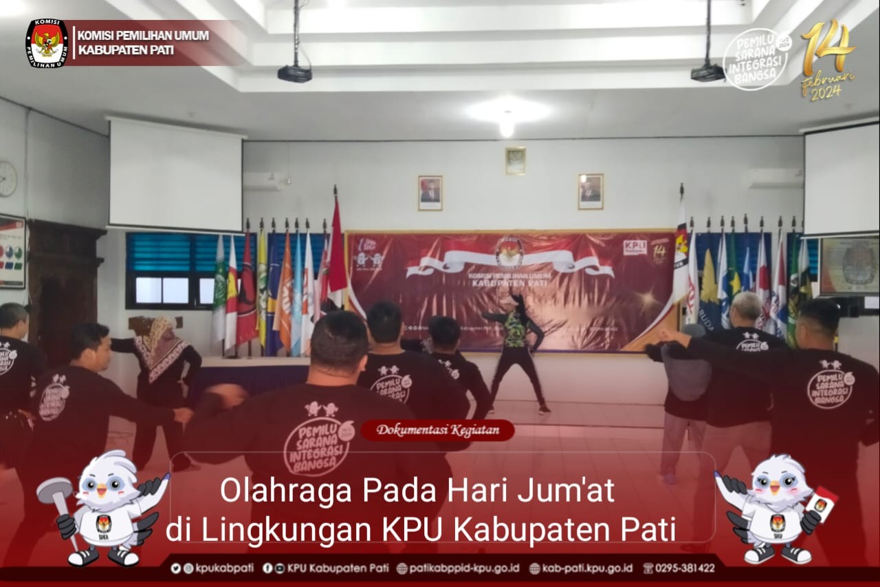 Dalam rangka menjaga dan meningkatkan kebugaran Pegawai untuk menunjang produktivitas dan optimaslisasi kinerja, maka diperlukan upaya untuk menjaga kesehatan serta kebugaran yang salah satunya melalui kegiatan olahraga.Sehubungan dengan hal tersebut di atas, maka Komisi Pemilihan Umum Kabupaten Pati Berdasar Surat Edaran Komisi Pemilihan Umum Nomor : 2963/SDM.07.1-SD/04/2023. melakukan olahraga pada hari jum'at di lingkungan kantor Komisi Pemilihan Umum Kabupaten Pati.