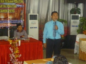 PATI-Komisi Pemilihan Umum (KPU) Kabupaten Pati menyampaikan informasi tahapan penyelenggaraan Pilkada Serentak 2017, kepada berbagai elemen masyarakat di Kabupaten Pati. Demikian disampaikan Anggota KPU Kabupaten Pati, Supriyanto, SH di Kantor KPU Pati, Kamis (21/4/2016). “Kami (KPU Pati/ red) aktif menyampaikan informasi tahapan penyelenggaraan Pilkada Serentak 2017, kepada berbagai elemen masyarakat di Kabupaten Pati. Kemarin (Rabu, (20/4/2014)/ red) siang, kami juga memberikan sosialisasi tahapan penyelenggaraan Pilkada Serentak 2017 kepada Parpol, Ormas dan LSM” ujarnya. Kegiatan Penguatan dan Peningkatan Peran Politik Ormas, LSM dan Parpol Kabupaten Pati Tahun 2016 yang diselenggarakan oleh Kantor Kesatuan Bangsa dan Politik (Kesbangpol) Kabupaten Pati kemarin dilaksanakan di Resto Winong 57, Jl. Ahmad Yani No.57- Pati pada pukul 12.30 WIB dan menghadirkan salah satu narasumber dari KPU Kab. Pati.