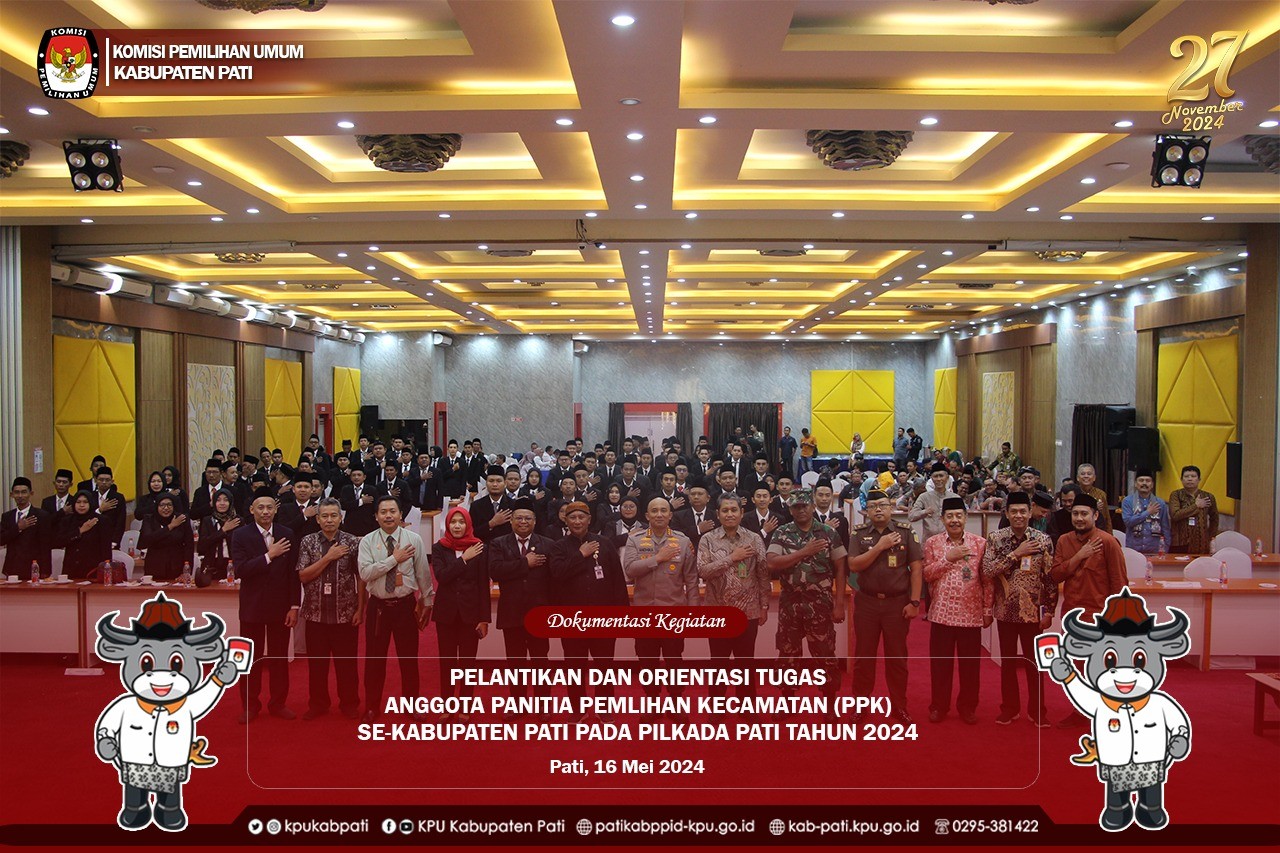 Komisi Pemilihan Umum (KPU) Kabupaten Pati melantik anggota Panitia Pemilihan Kecamatan (PPK) untuk Pemilihan Kepala Daerah (Pilkada) serentak 2024. Selain mengucapkan sumpah janji, penyelenggara pemilihan tingkat kecamatan yang dilantik itu juga menandatangani pakta integritas penyelenggaraan pemilihan.