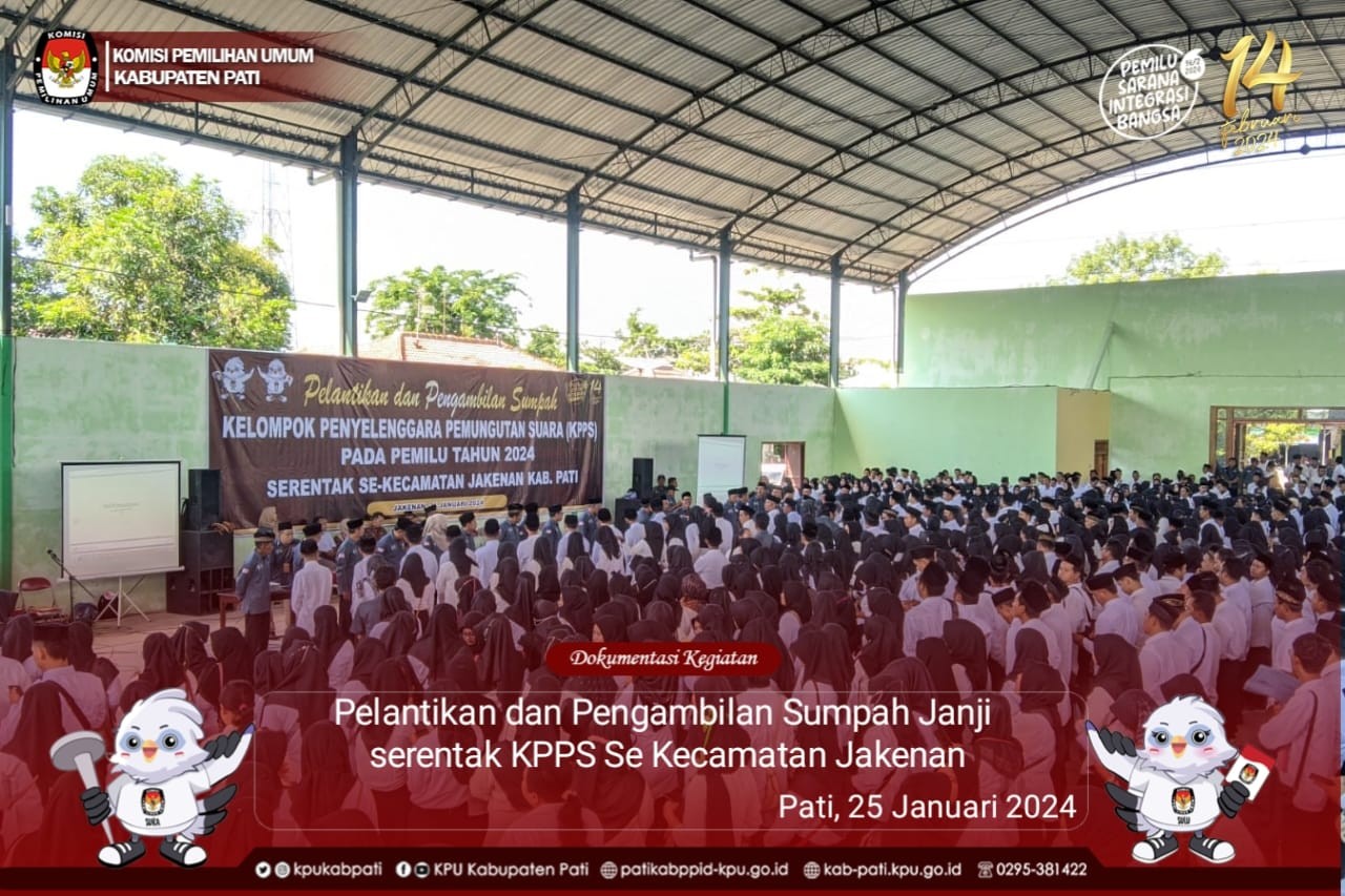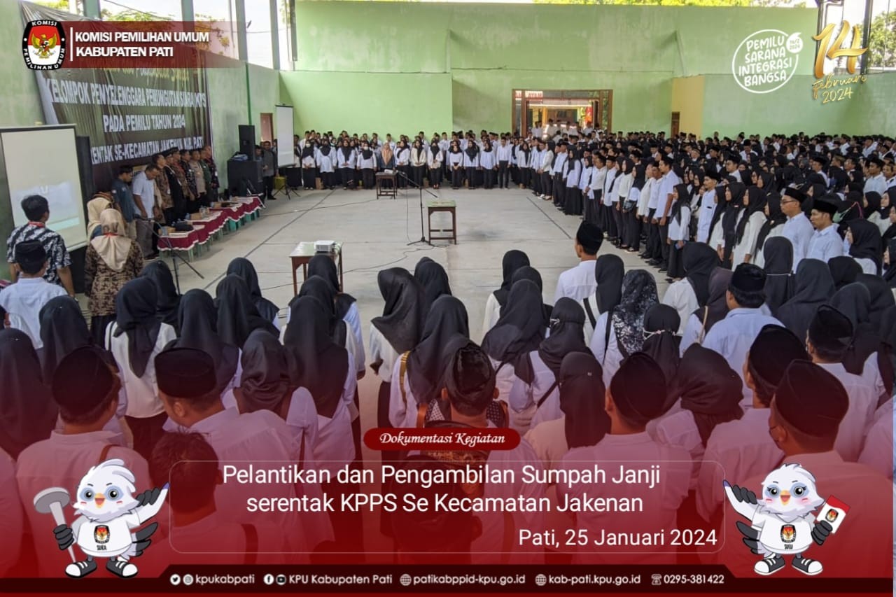 Pelaksanaan acara ini merupakan salah satu kesiapan Pemilu Serentak di Wilayah Kecamatan Jakenan. KPPS yang dilantik sangat khidmat dalam pengambilan sumpah dan janji, setelah itu dilanjutkan dengan penandatanganan pakta integritas oleh seluruh KPPS di wilayah Kecamatan Jakenan yang berjumlah 1225 tersebar dalam 175 TPS.