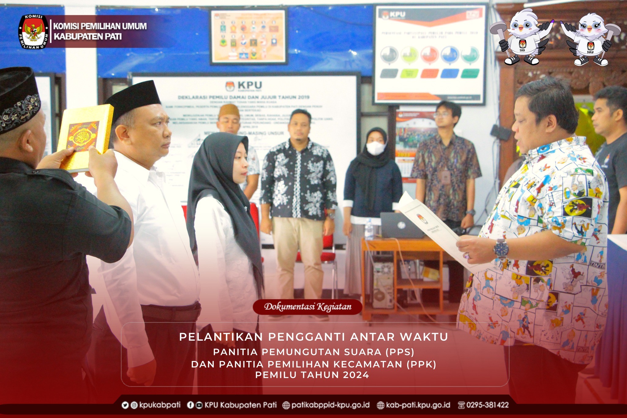 KPU Kabupaten melaksanakan Pelantikan Pengganti Antar Waktu Panitia Pemiihan Kecamatan ( PPK ) Kecamatan Jakenan dan Panitia Pemungutan Suara Desa Glonggong Kecamatan Jakenan untuk Pemilu 2024 pada Jumat 10 Maret 2023.
