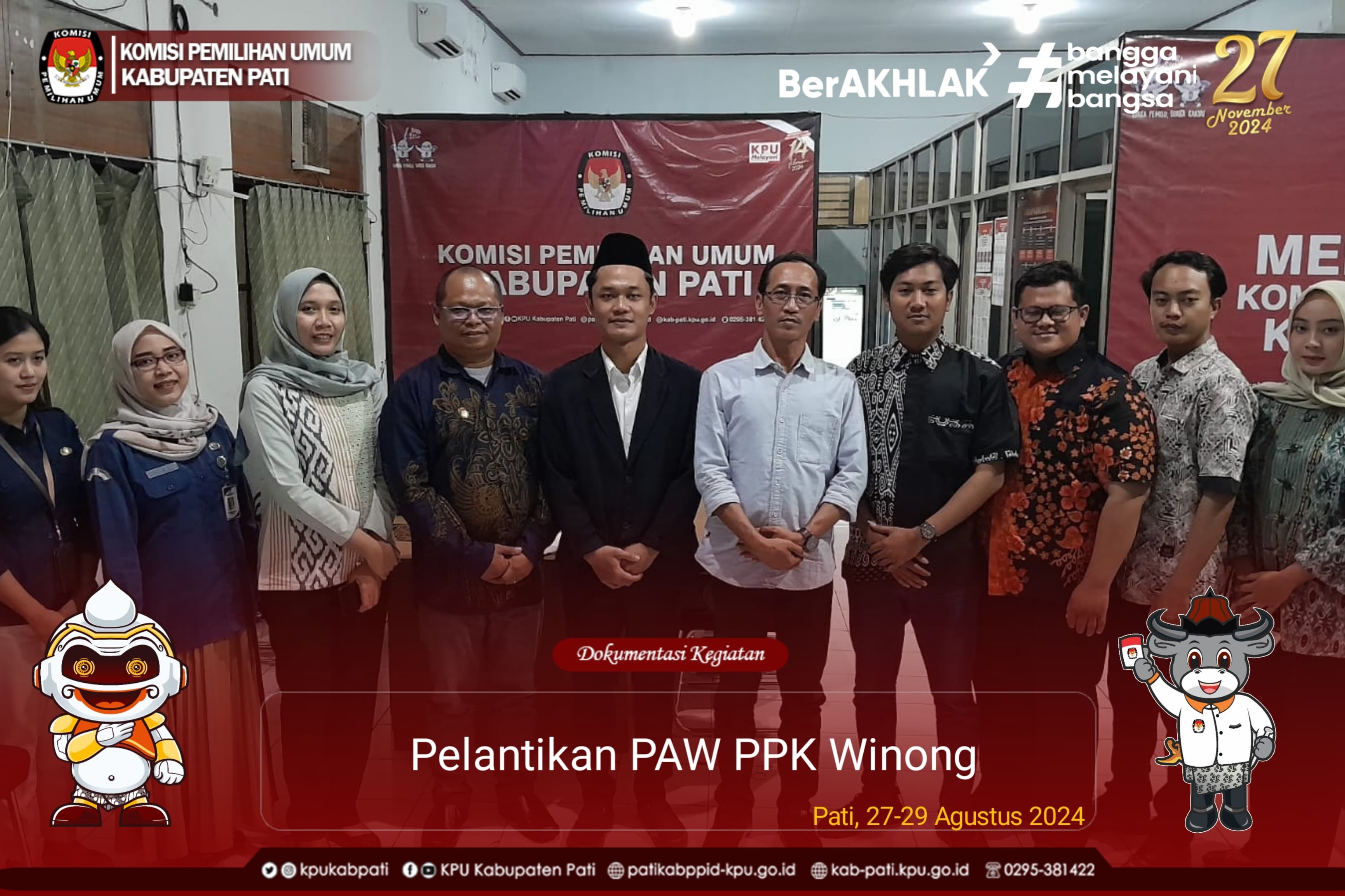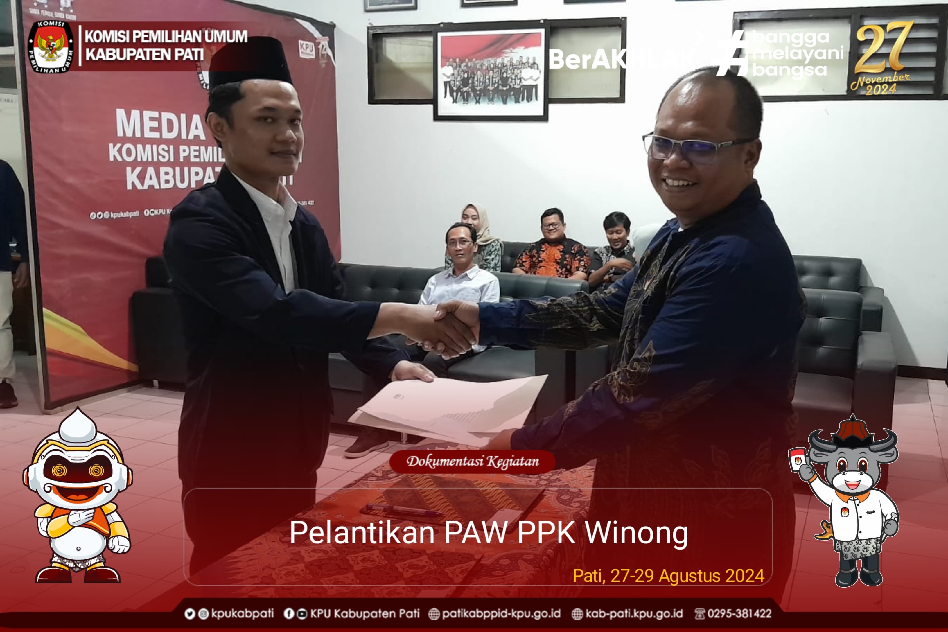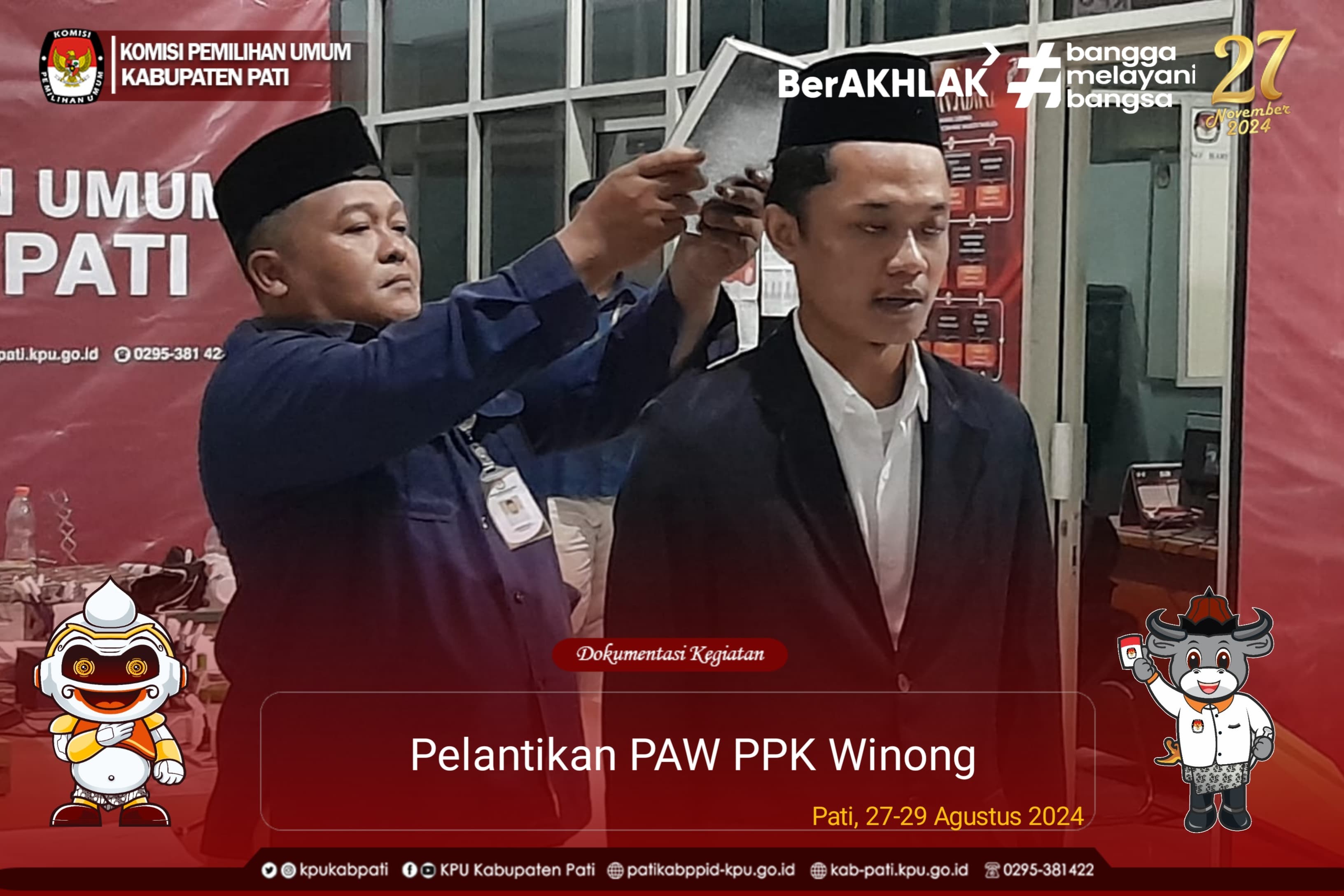 Pada hari ini selasa 27 Agustus 2024, KPU Kabupaten Pati melantik anggota PPK Winong Rizal Nugroho menggantikan Novita Wulansari.