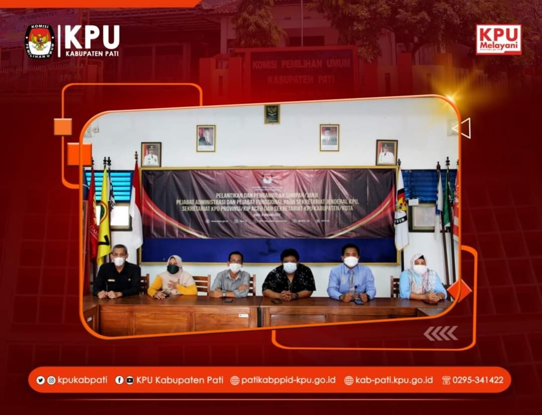Rabu (5/1) Komisioner KPU Kabupaten Pati dan Sekretaris mengahiri pelantikan pejabat administrasi dan pejabat fungsional pada Sekretariat Jenderal KPU, Sekretariat KPU Provinsi/KIP Aceh dan Sekretariat KPU Kabupaten/kota. Secara daring melalui zoom Meeting.