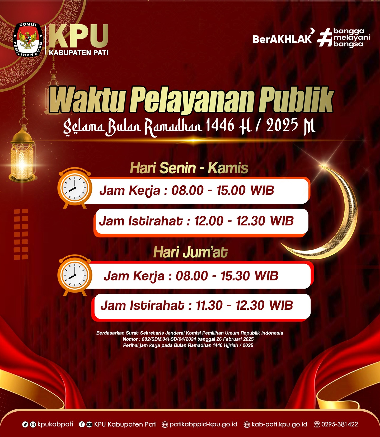 Merujuk pada Surat Dinas Sekretaris Jenderal KPU Nomor 682/SDM.04.1-SD/04/2025.Berikut kami sampaikan Waktu pelayanan selama bulan Ramadan 2025 (1446 Hijriah) di Komisi Pemilihan Umum (KPU) Kabupaten Pati