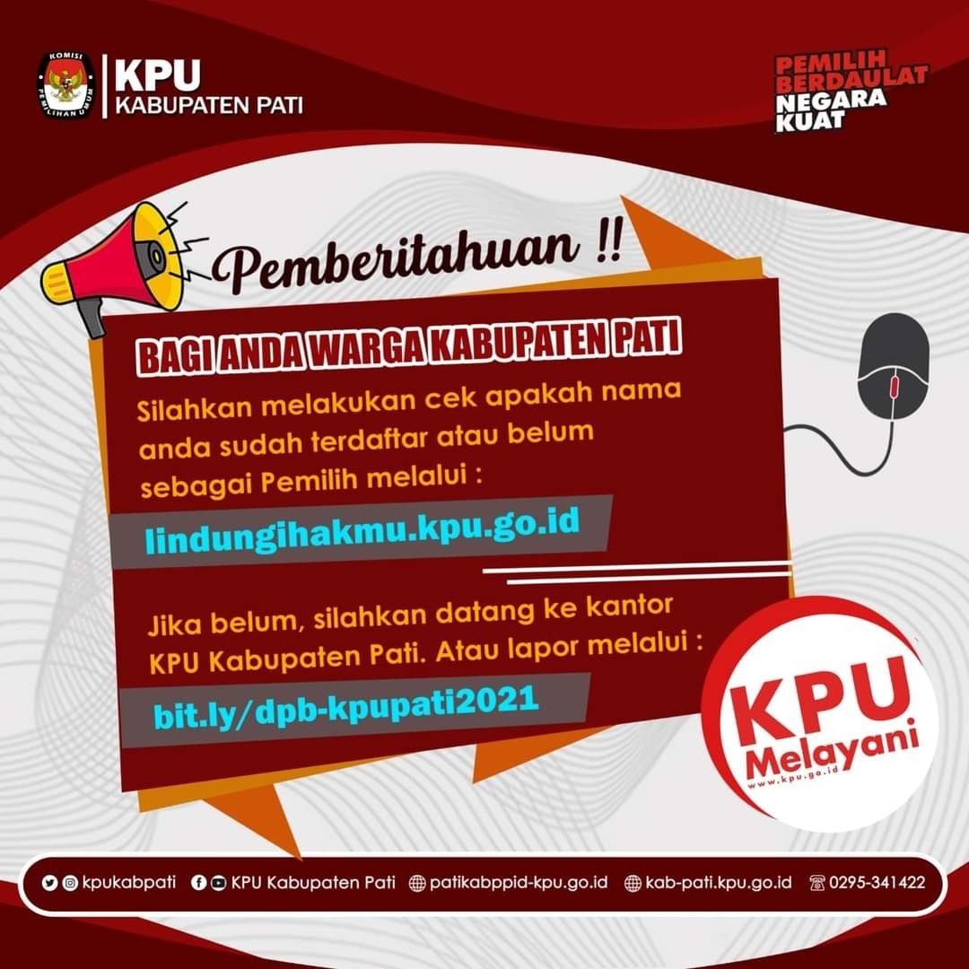 Bagi anda warga Pati yang belum terdaftar sebagai pemilih atau mengalami perubahan identitas diri, dapat melaporkan secara online dengan mengisi formulir di: bit.ly/dpb-kpupati2021