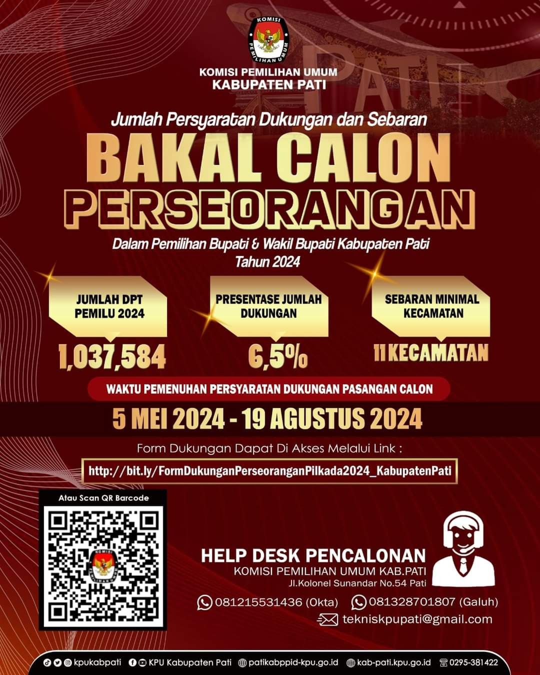 Berikut pengumuman untuk warga masyarakat yang ingin ikut serta mencalonkan diri dalam Pemilihan Bupati dan Wakil Bupati Pati Tahun 2024 melalui jalur perseorangan.