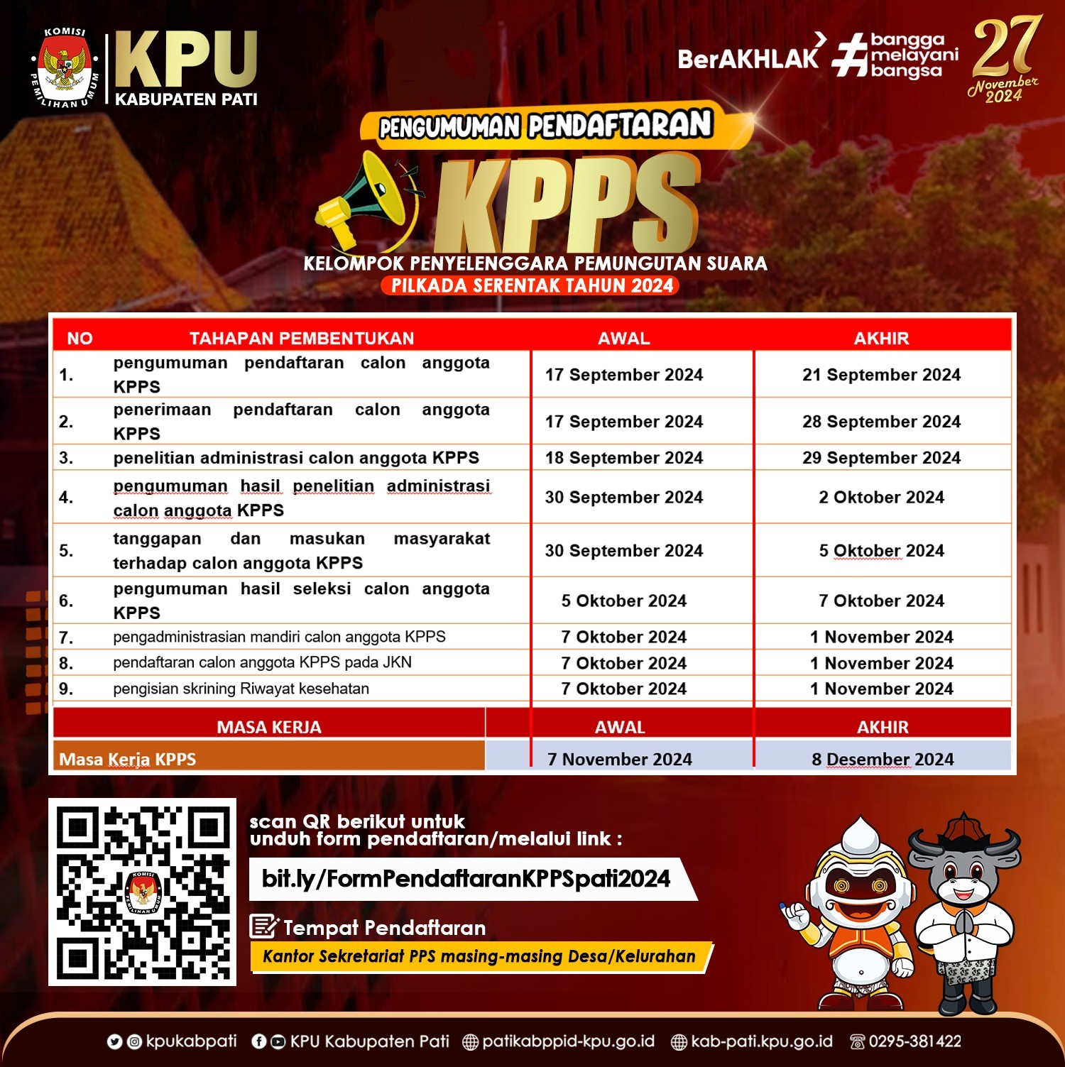 Berikut kami sampaikan pengumuman penerimaan pendaftaran calon anggota Kelompok Penyelenggara Pemungutan Suara ( KPPS) Pilkada serentak tahun 2024. penerimaan pendaftaran calon anggota KPPS di kantor sekretariat PPS masing-masing Desa/kelurahan.