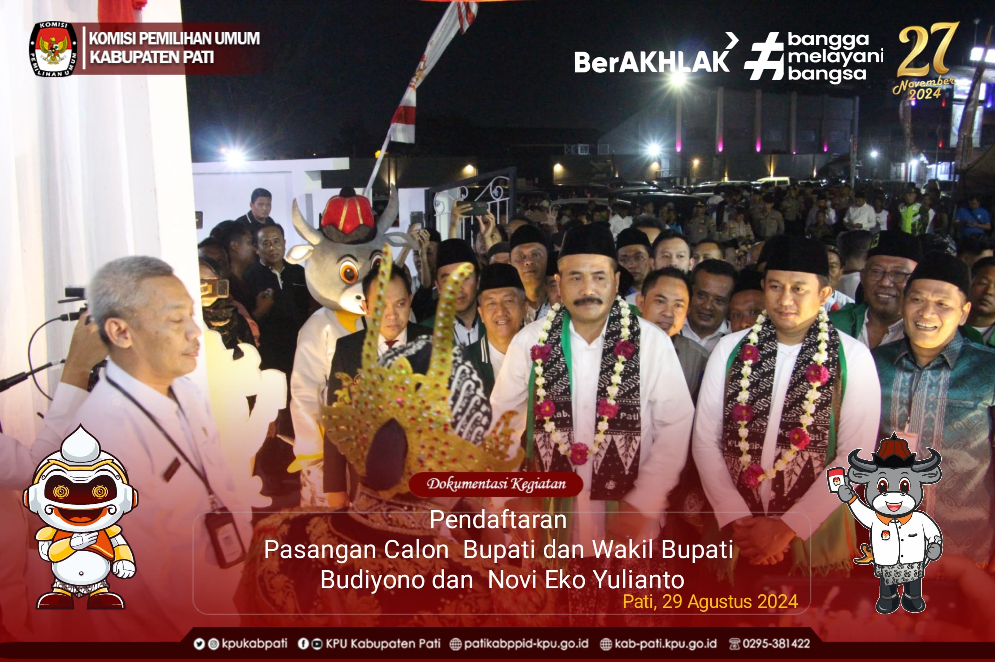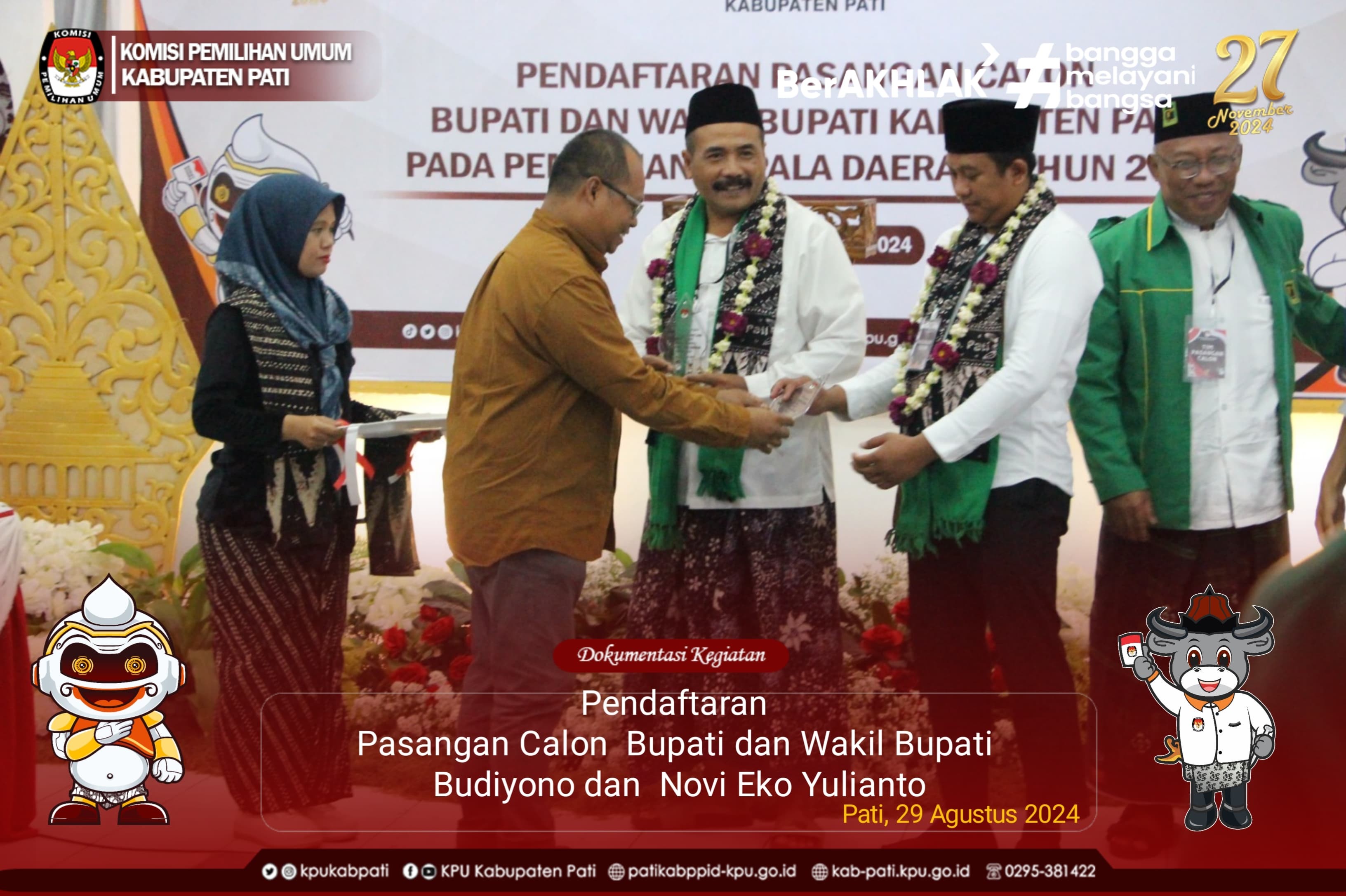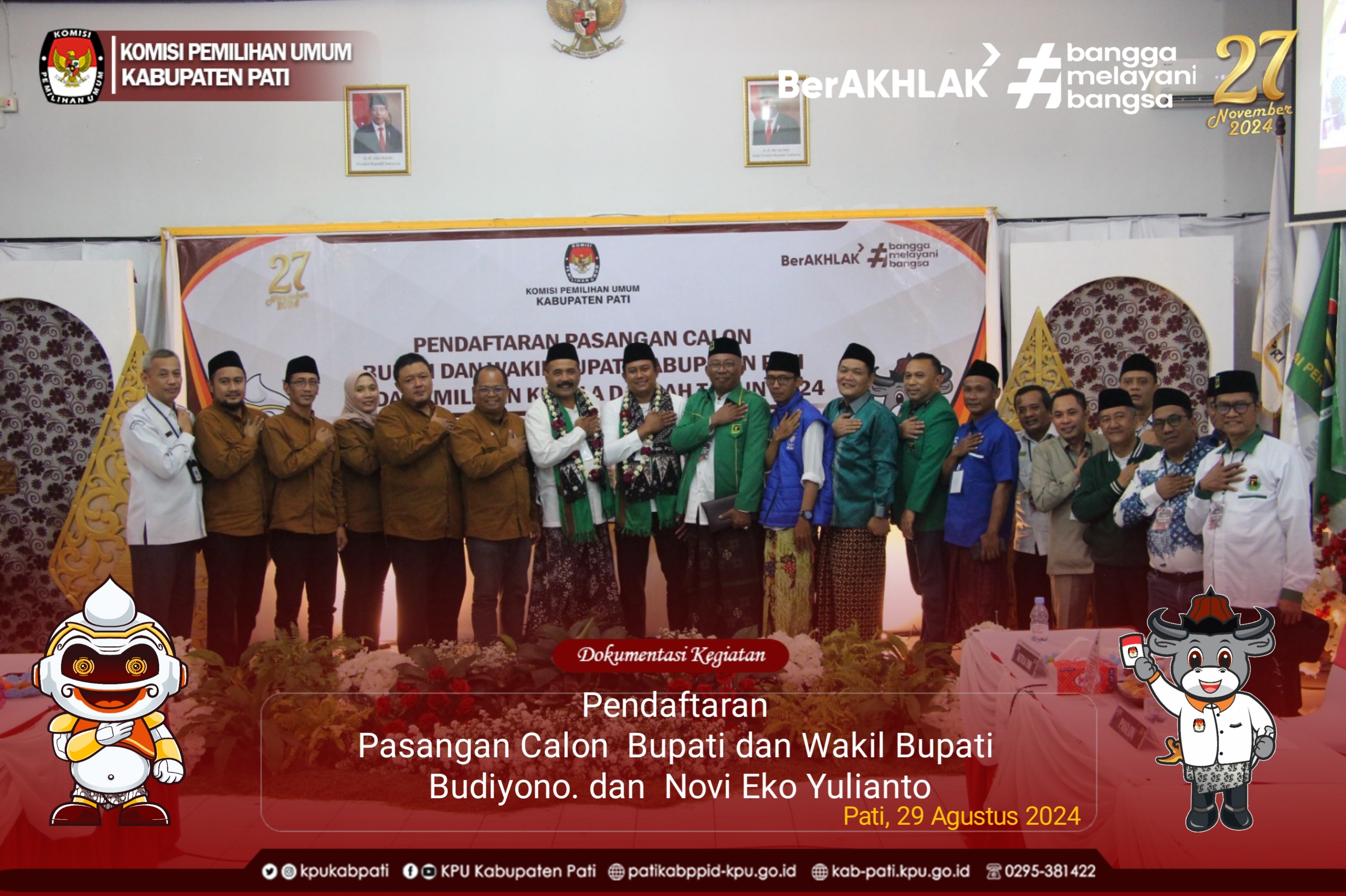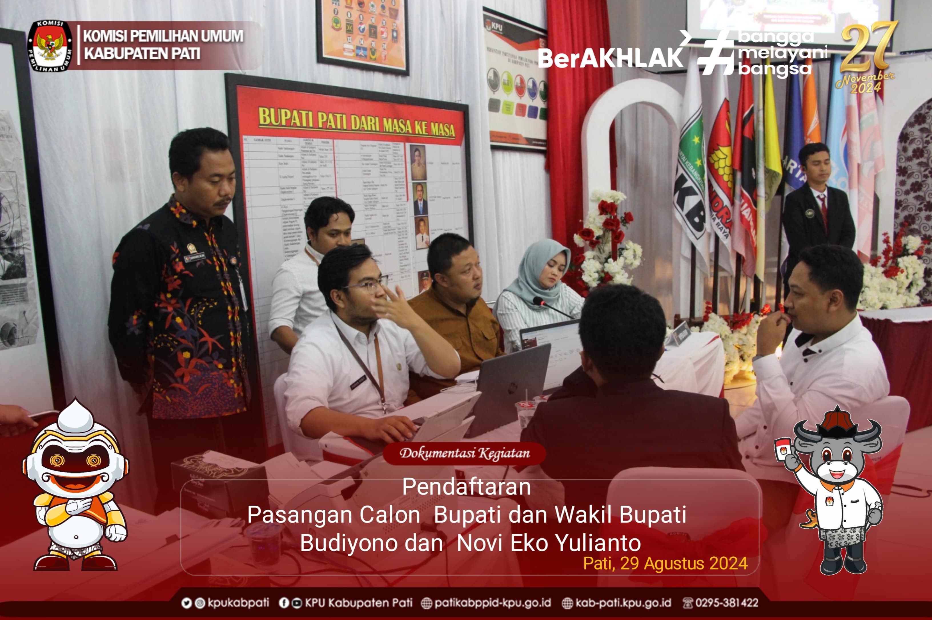Kegiatan Pendaftaran Pendaftaran Pasangan calon Bupati dan Wakil Bupati Kabupaten Pati dapat diikuti Live di Youtube dan portal medsos KPU kabupaten Pati. Dokumentasi kegiatan Pendaftaran dapat dilihat di Sini