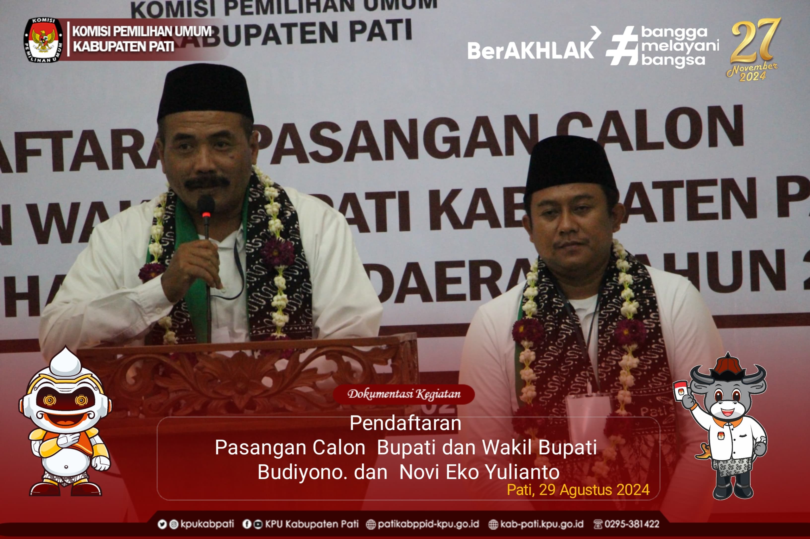 Hari ini Kamis, 29 Agustus 2024 pendaftaran Pasangan calon Bupati dan Wakil Bupati Pati hari terakhir, Pendaftaran berlangsung dari hari selasa tanggal 27 Agustus 2024 berakhir hari kamis tanggal 29 Agustus pukul 23.59 wib. Di hari terakhir ini KPU Kabupaten Pati selain menerima pendaftaran Pasangan Calon Bupati dan wakil Bupati Wahyu Indriyanto, S.E . dan Ir.Suharyono, M.M. KPU Kabupaten Pati juga menerima Pendaftaran dari partai yang diusung Partai Persatuan Pembangunan ( PPP ) dan Partai Amanat Nasional (PAN) Pasangan Calon Bupati dan Wakil Bupatiyang diusung PPP dan PAN yaitu Budiono dan Yuli Eko Budiyanto.