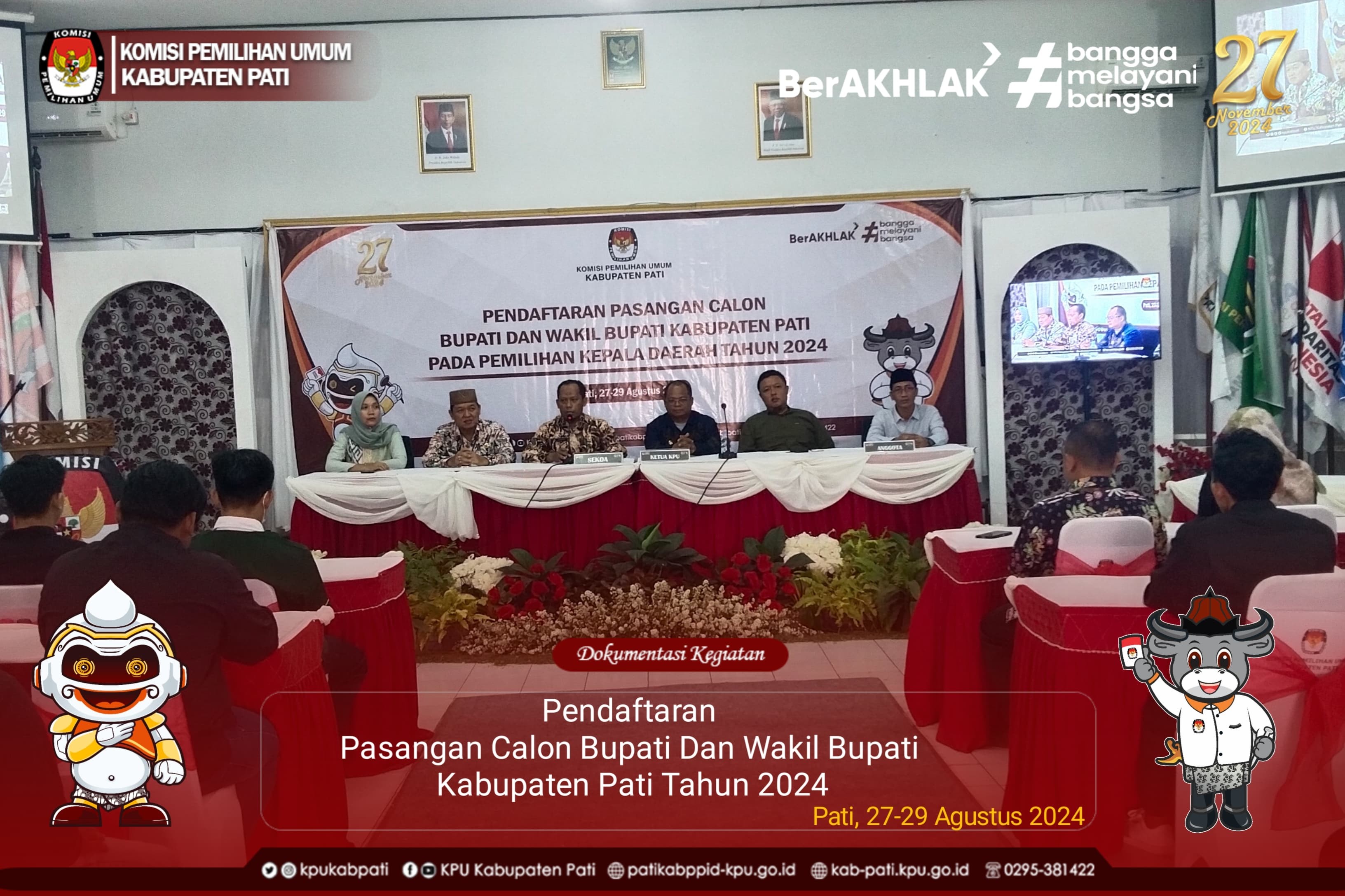 Hari ini, 27 Agustus 2024, KPU kabupaten Pati membuka pendaftaran Paslon Bupati dan wakil Bupati Pati untuk Pilkada 2024. Acara secara resmi dibuka oleh ketua KPU Pati, Supriyanto tepat pukul 08:00 WIB. Acara tersebut dihadiri oleh Sekda Pati, Bawaslu, Kepala Kesbangpol, Perwakilan Parpol dan Anggota PPK.
