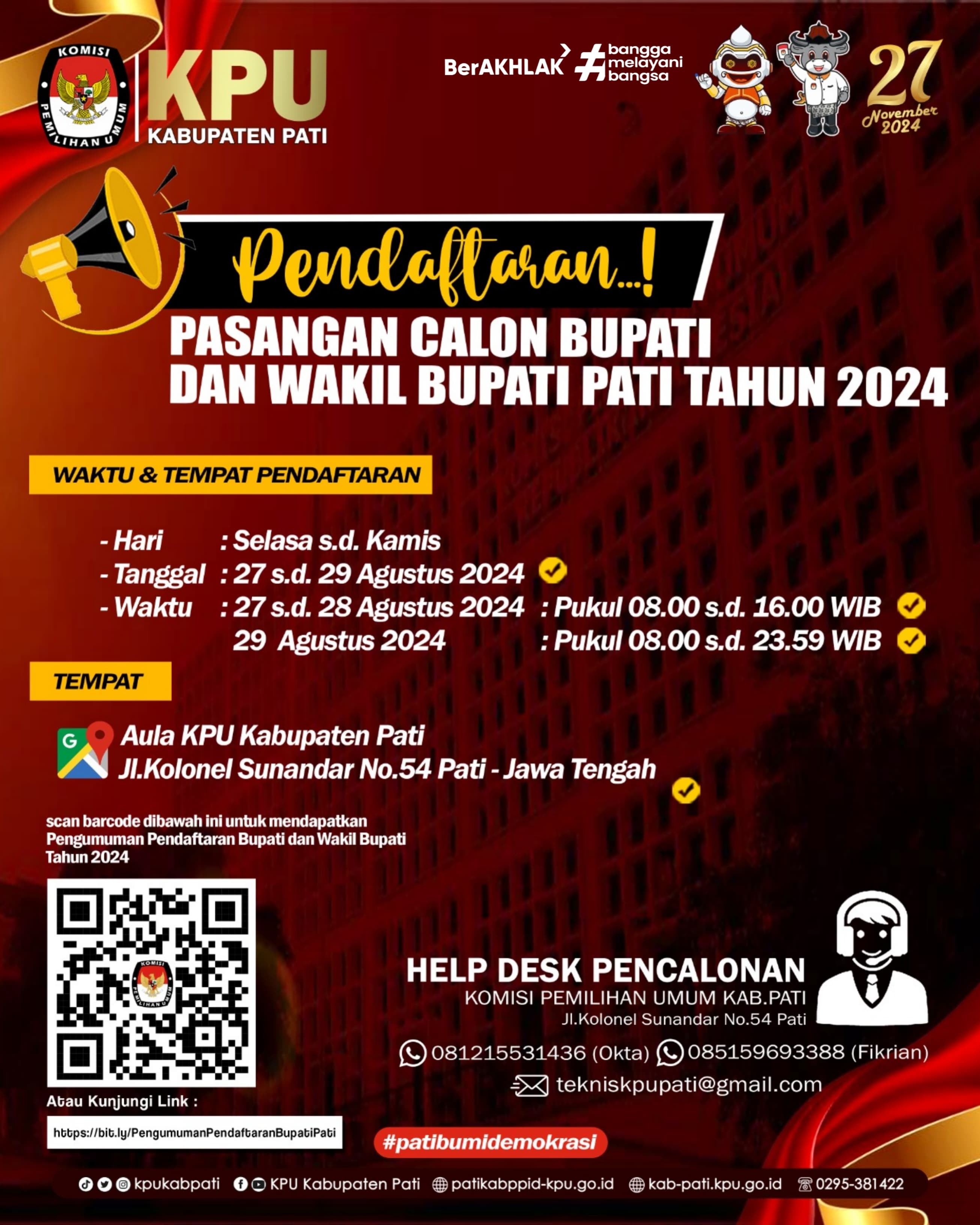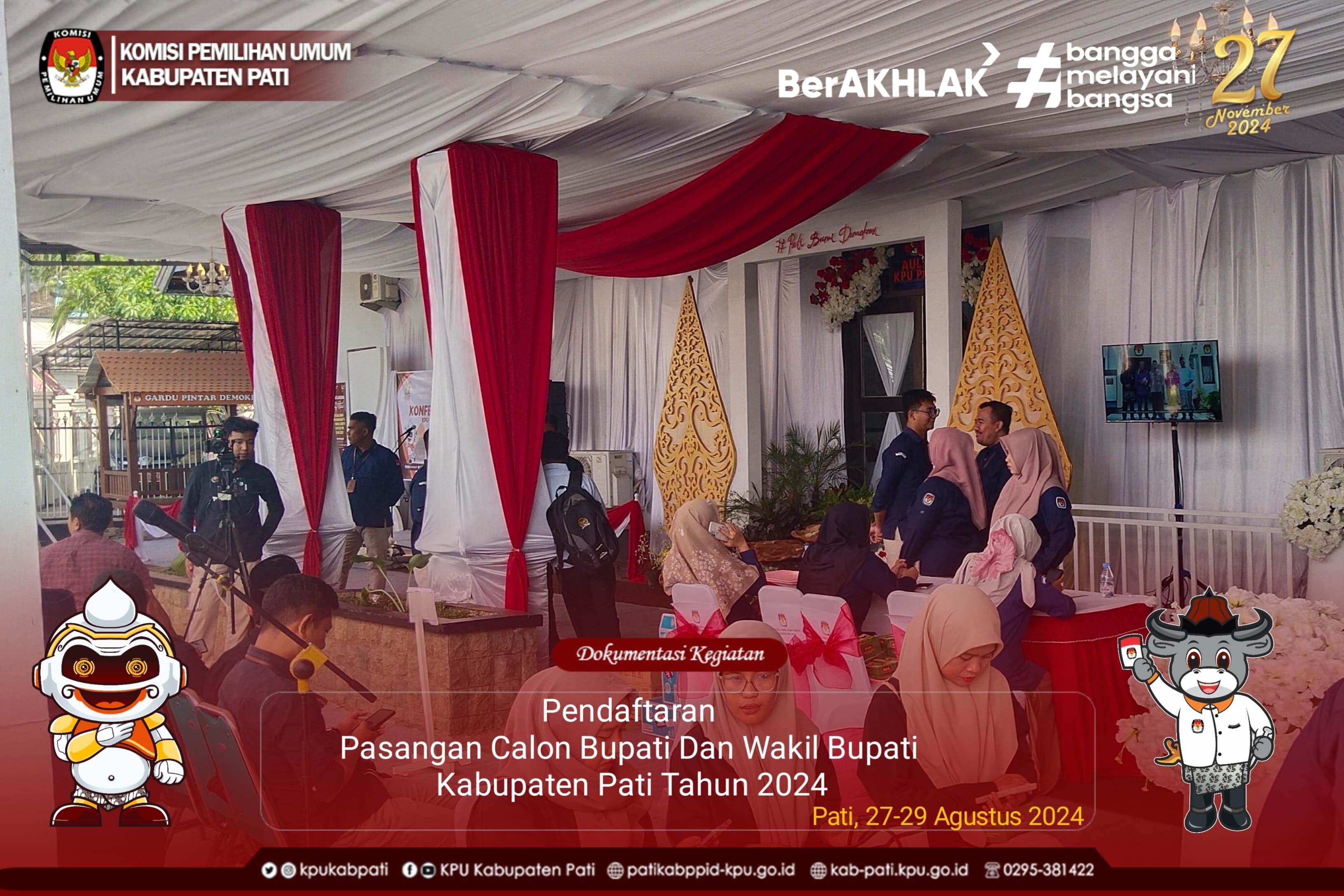 Kegiatan Pendaftaran Pendaftaran Pasangan calon Bupati dan Wakil Bupati Kabupaten Pati dari hari pertama sampai dengan penutupan dapat diikuti Live di Youtube dan portal medsos KPU kabupaten Pati. Dokumentasi kegiatan Pendaftaran dapat dilihat di Sini