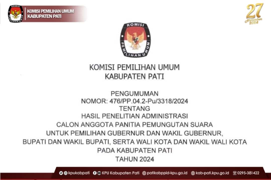 Berikut kami sampaikan Pengumuman Nomor : 476/PP.04.2-Pu/3318/2024 Tentang Hasil Penelitian Administrasi Calon Anggota Panitia Pemungutan Suara Untuk Pemilihan Gubernur Dan Wakil Gubernur, Bupati Dan Wakil Bupati, Serta Wali Kota Dan Wakil Wali Kota pada Kabupaten Pati Tahun 2024