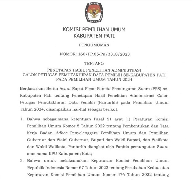 Berikut kami sampaikan Pengumuman Nomor : 160/PP.05-Pu/3328/2023 Tentang Penetapan Hasil Penelitian Administrasi Calon Petugas Pemutakhiran Data Pemilih Se-Kabupaten Pati untuk Pemilihan Umum Tahun 2024.