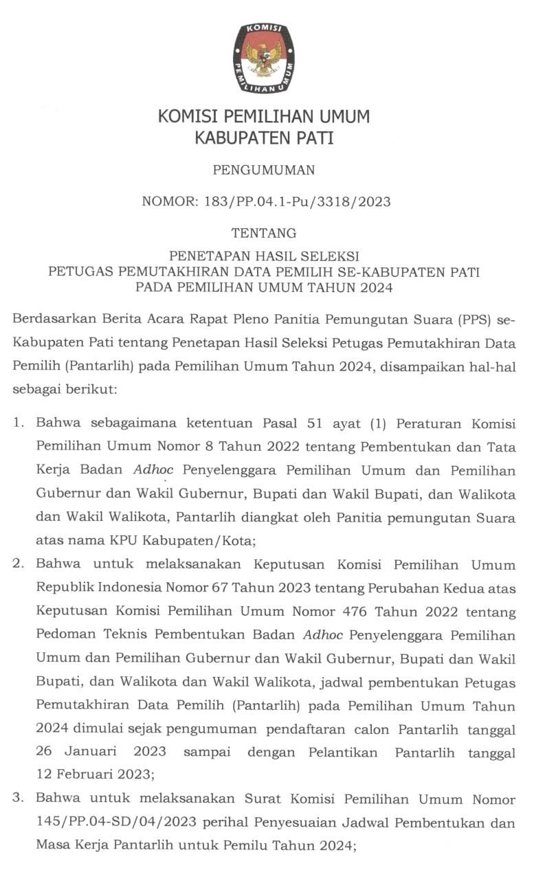 Berikut kami sampaikan Pengumuman Nomor : 183/PP.04.1-Pu/3318/2023 Tentang Penetapan Hasil Seleksi Petugas Pemutakhiran Data Pemilih Se-Kabupaten Pati Pada Pemilihan Umum Tahun 2024