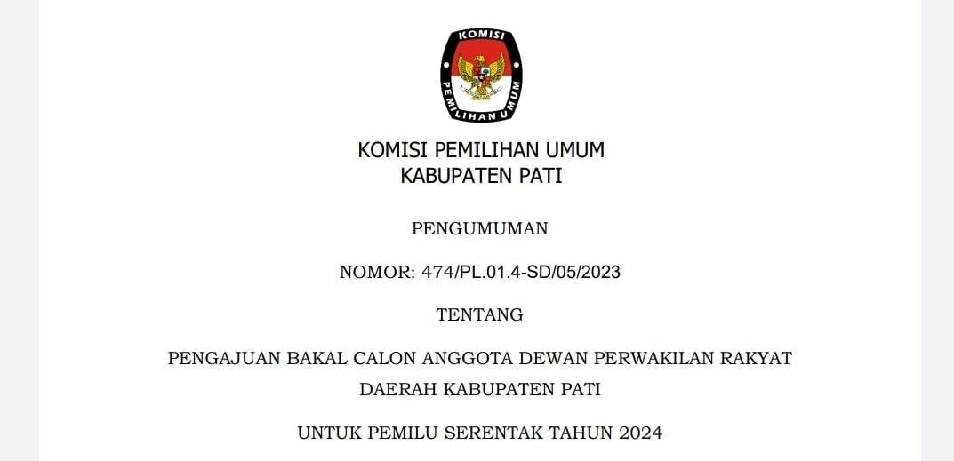 Pengumuman Nomor:474/PL.01.4-SD/05/2023 Tentang Pengajuan Bakal Calon Anggota Dewan Perwakilan Rakyat Daerah Kabupaten Pati