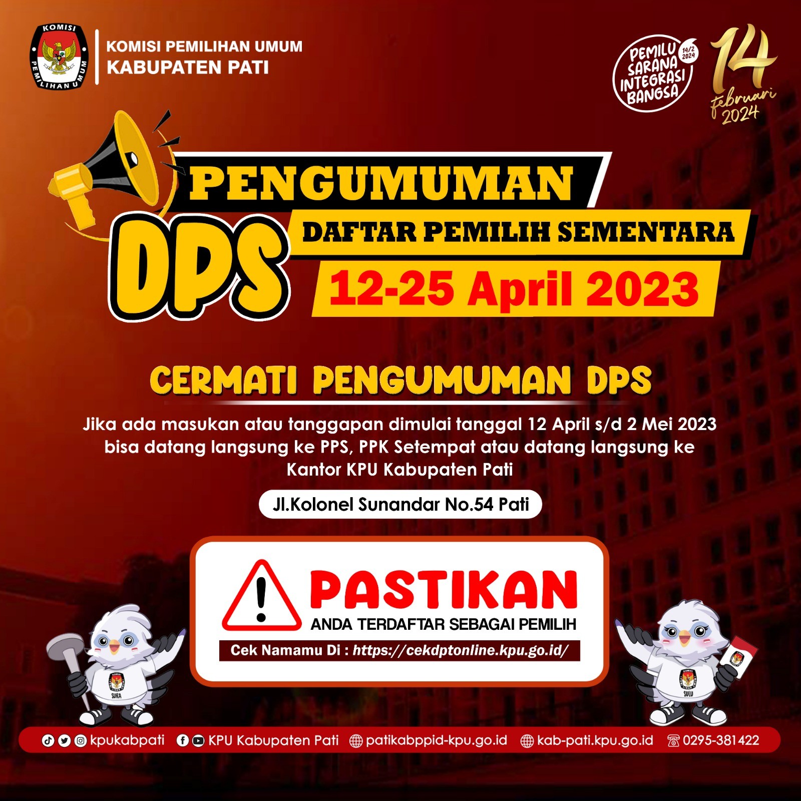 Hola teman pemilih besok tanggal 12 - 25 April 2023 akan ada Pengumuman Daftar Pemilih Sementara (DPS) Kabupaten Pati. Silahkan jika ada masukan atau tanggapan bisa datang langsung ke PPS, PPK setempat atau datang ke Kantor KPU Kabupaten Pati mulai 12 April sampai 2 Mei 2023