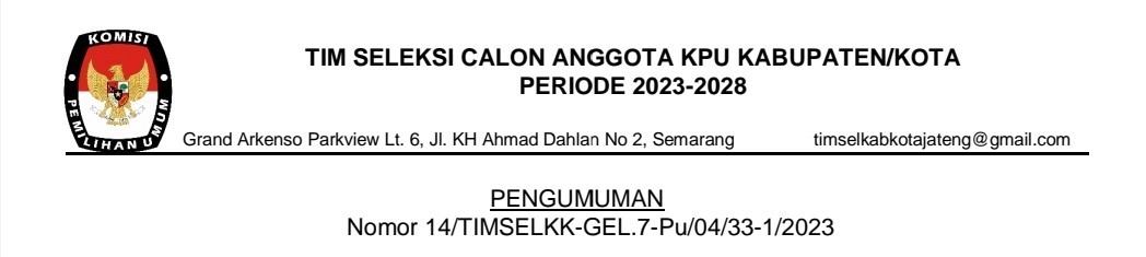 PENGUMUMAN HASIL SELEKSI CALON ANGGOTA KPU KABUPATEN/KOTA PROVINSI JAWA TENGAH PERIODE 2023-2028