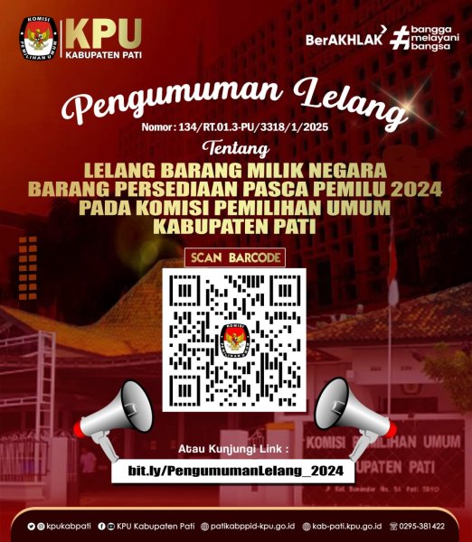 Berikut kami umumkan Lelang Nomor; 134/RT.01.3-PU/3318/1/2025 tentang Lelang Barang Milik Negara Barang Persediaan Pasca pemilu 2024 Pada Komisi Pemilihan Umum Kabupaten Pati