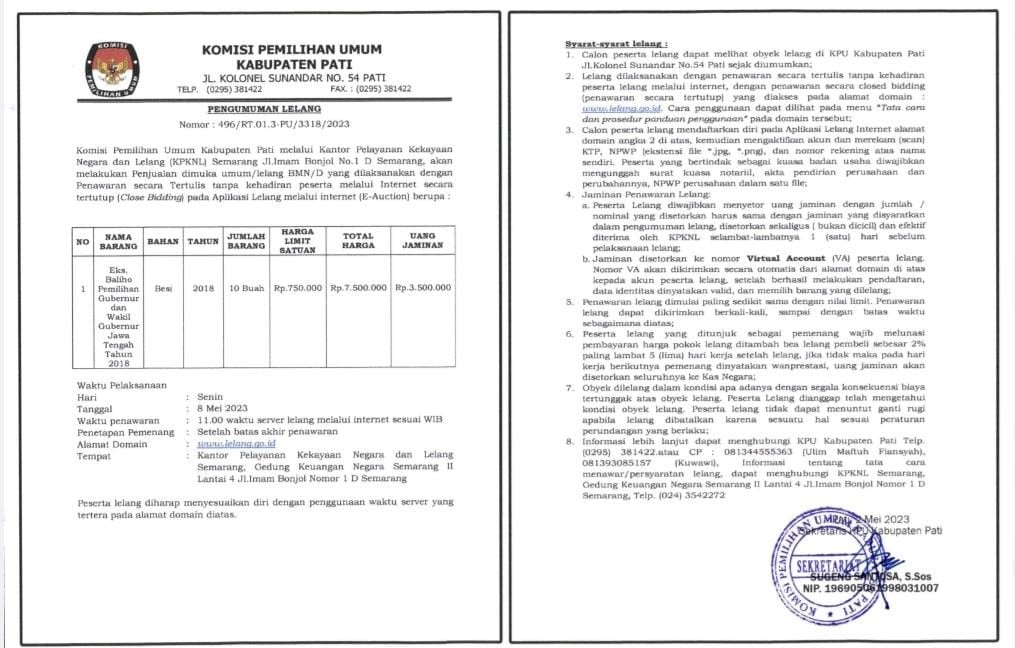 Berikut kami sampaikan Pengumuman Lelang Nomor:496/RT.01.3.PU/3318/2023