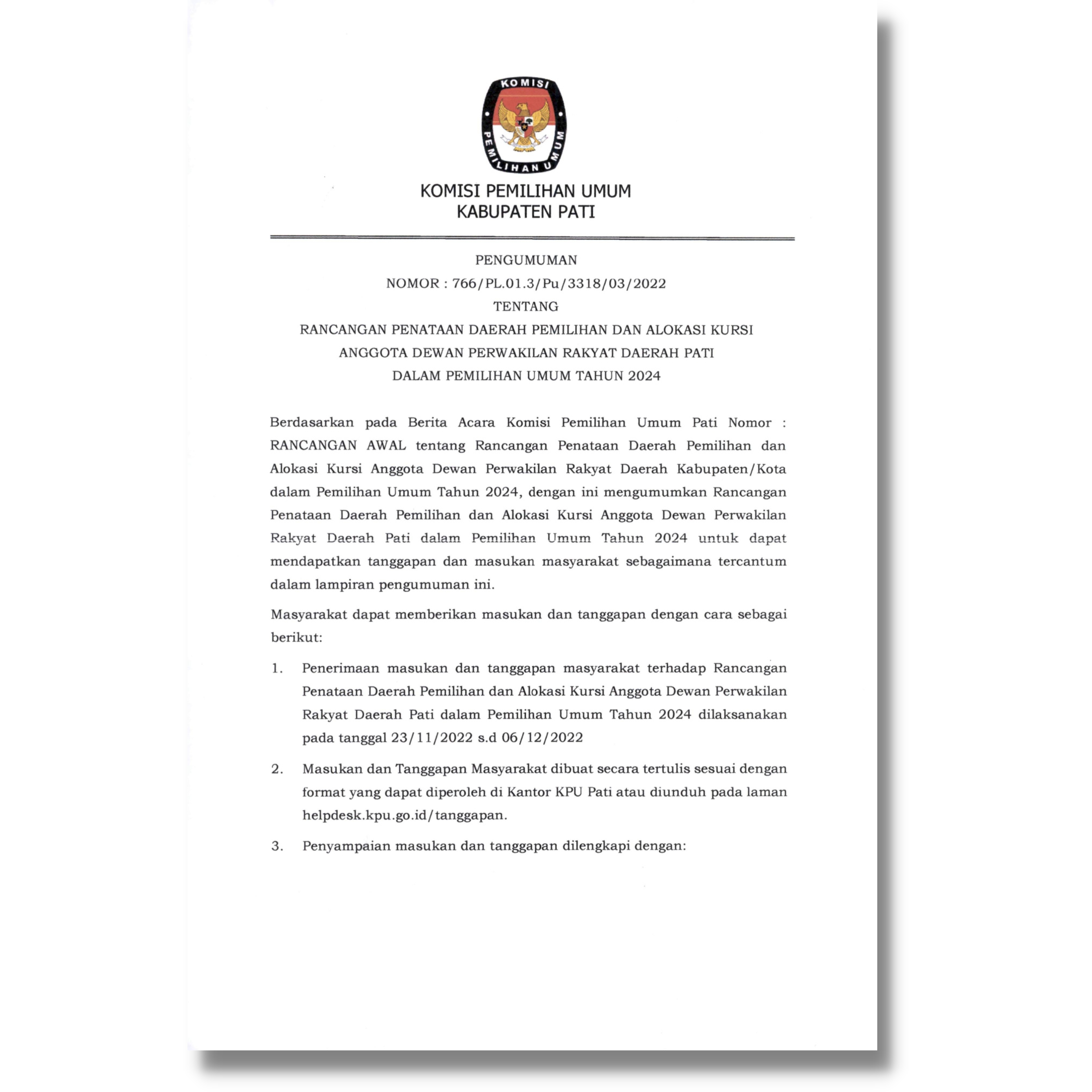 Pengumuman Nomor : 766 Tentang Rancangan Penataan Daerah Pemilihan Dan Alokasi Kursi Anggota Dewan Perwakilan Rakyat Daerah Pati Dalam Pemilihan Umum Tahun 2024