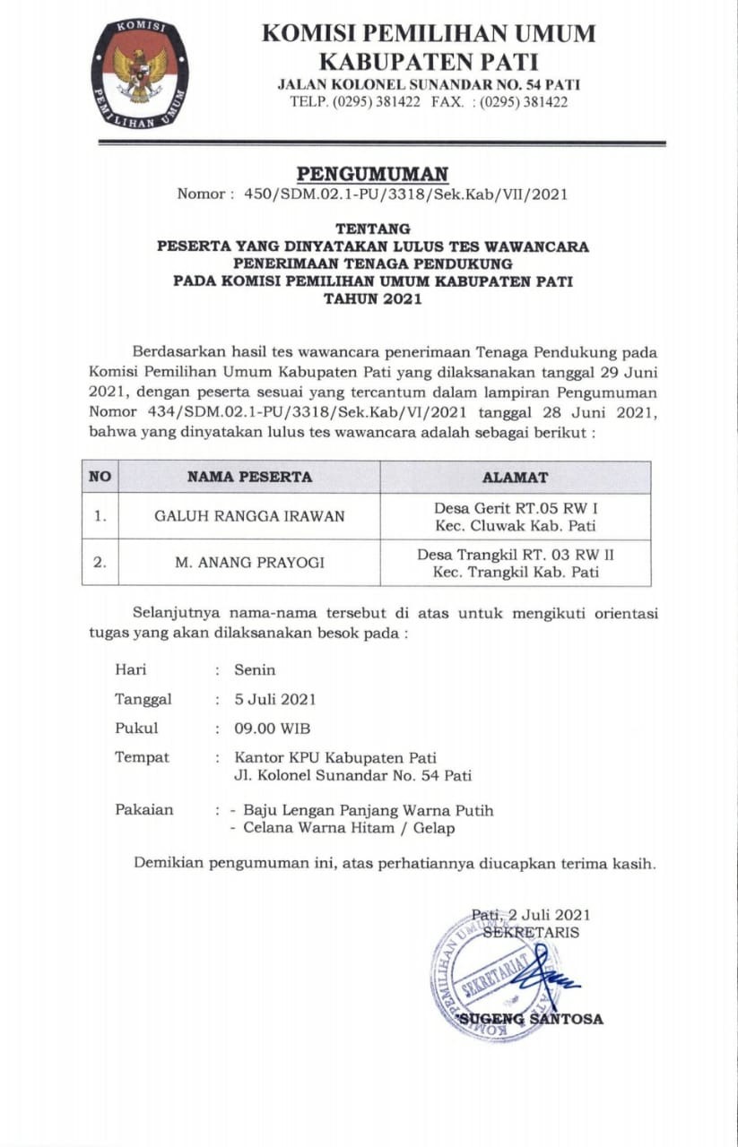 Pengumuman Peserta Lulus Tes Wawancara Penerimaan Tenaga Pendukung Pada Komisi Pemilihan Umum Kabupaten Pati Tahun 2021